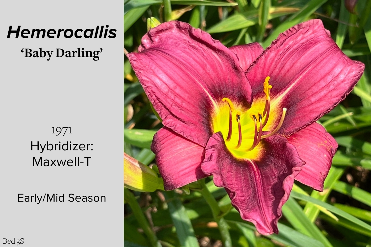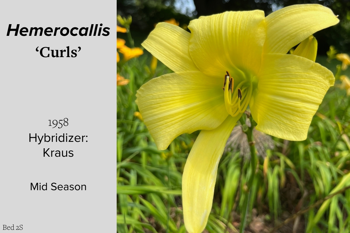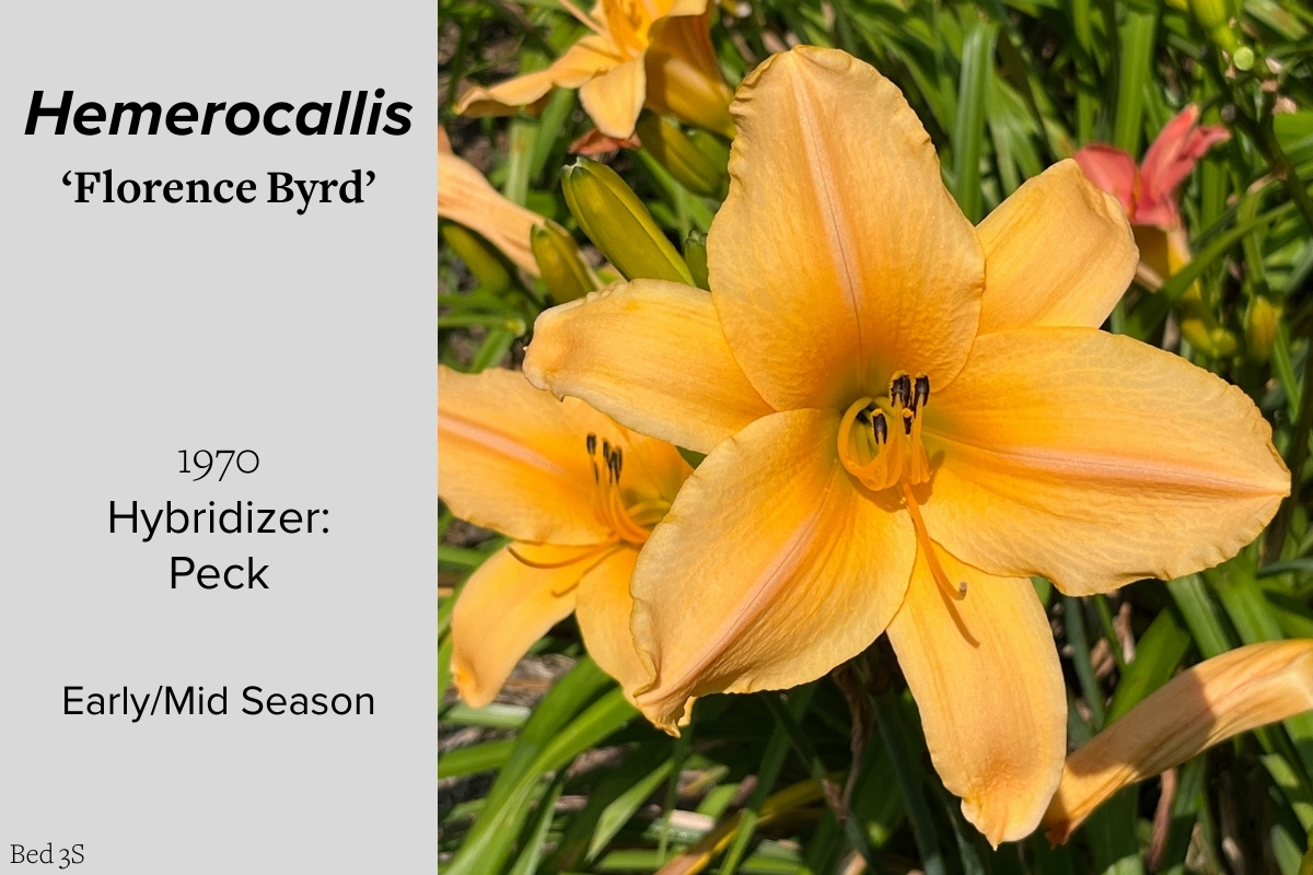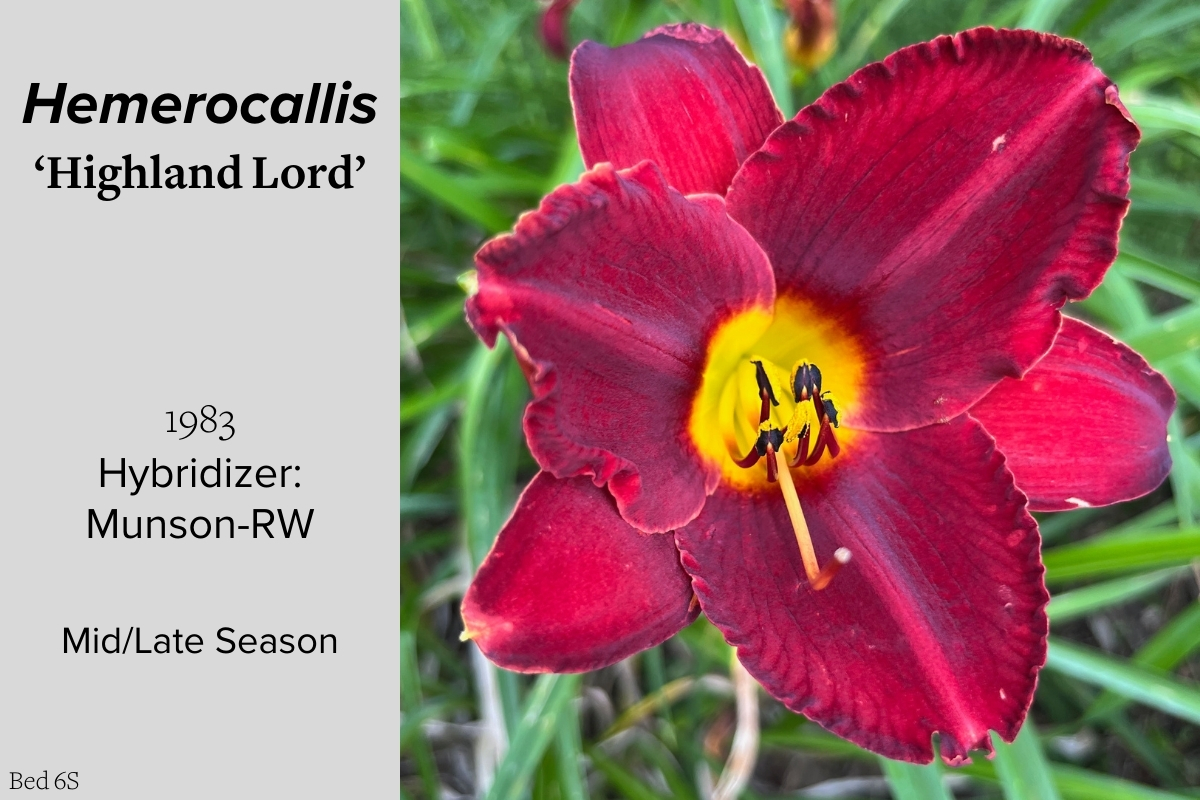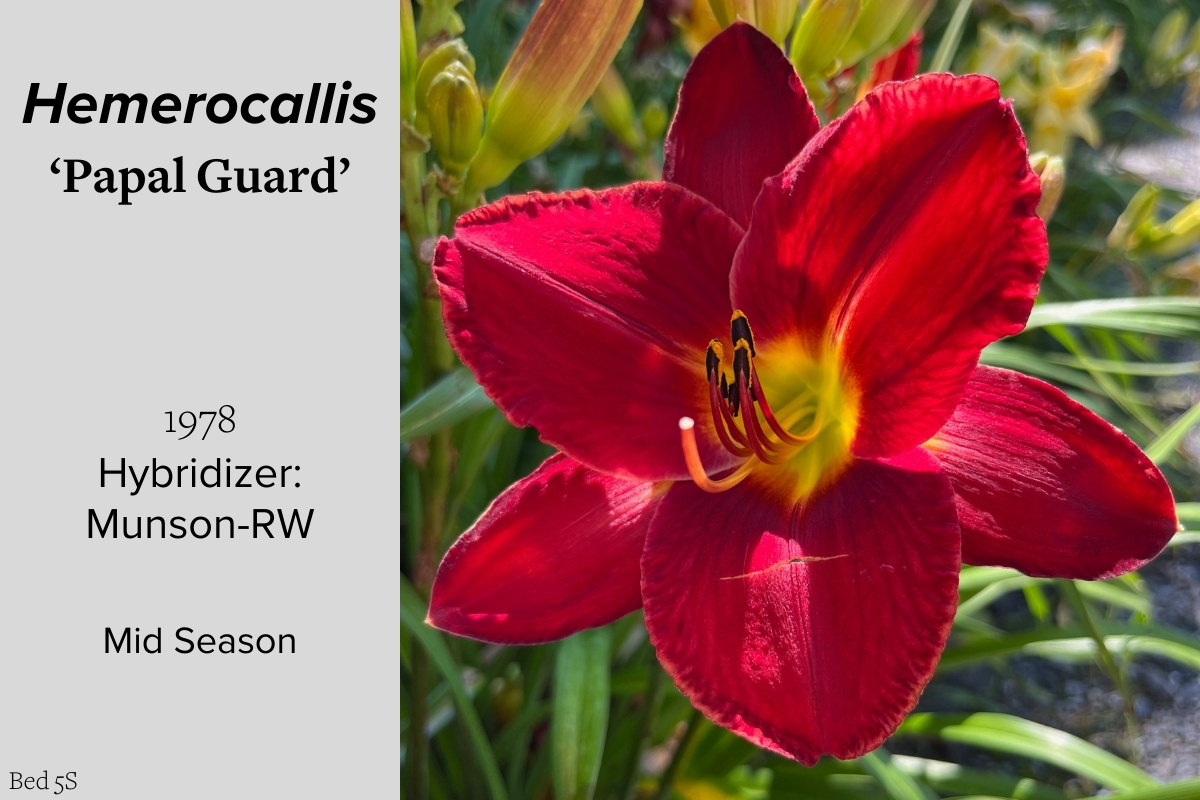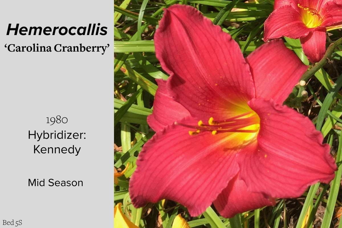Our collection of 200 daylily cultivars is organized chronologically by the year each was registered with the American Hemerocallis Society. Just beyond this sign at the top of the walk, are six forms of wild daylilies that represent the pure species from which the cultivars were derived.