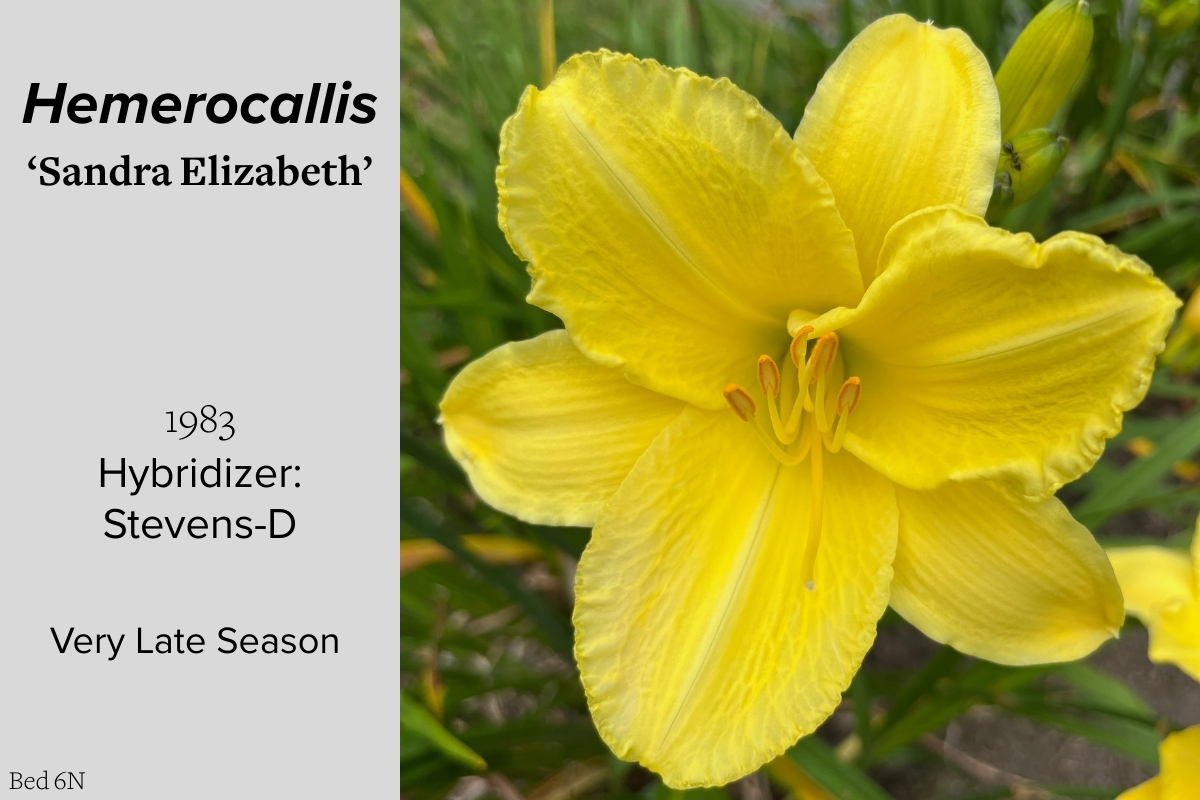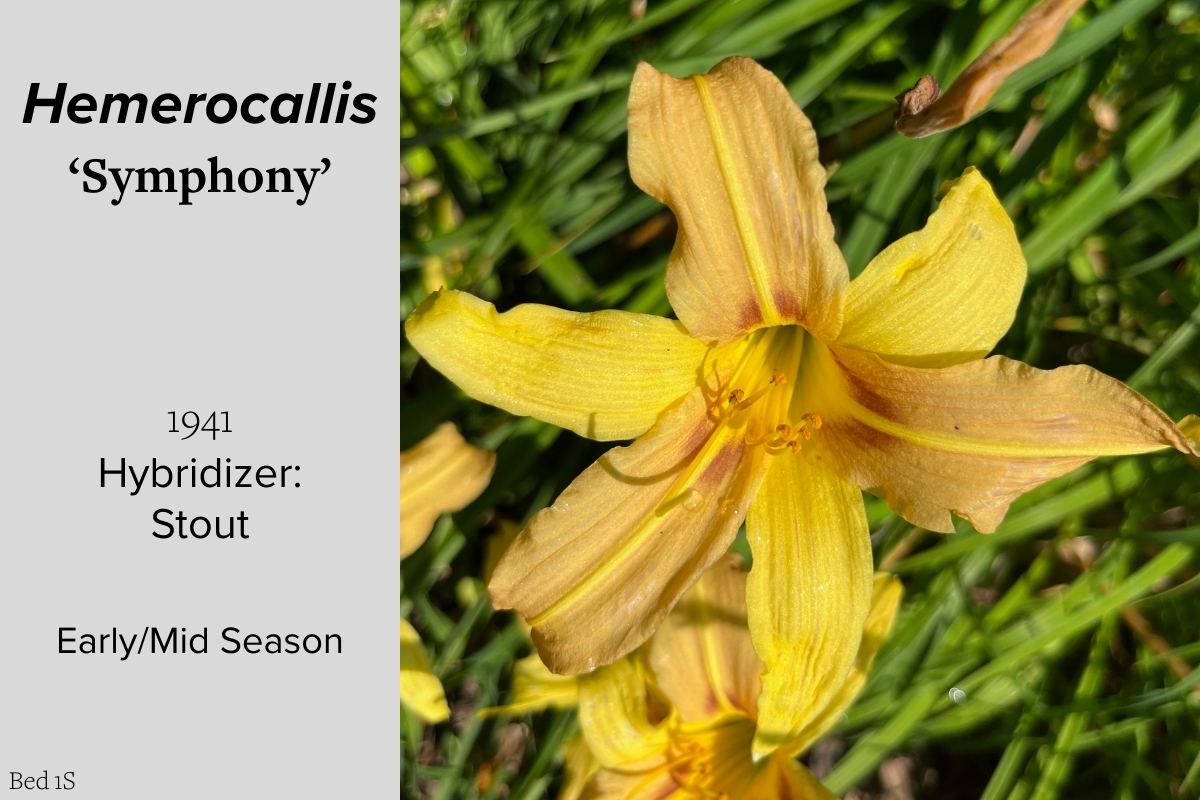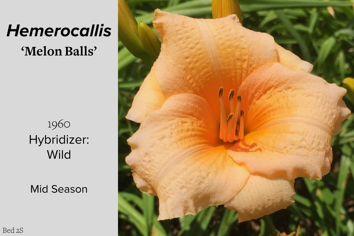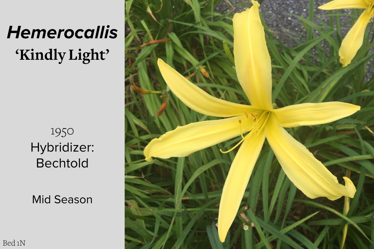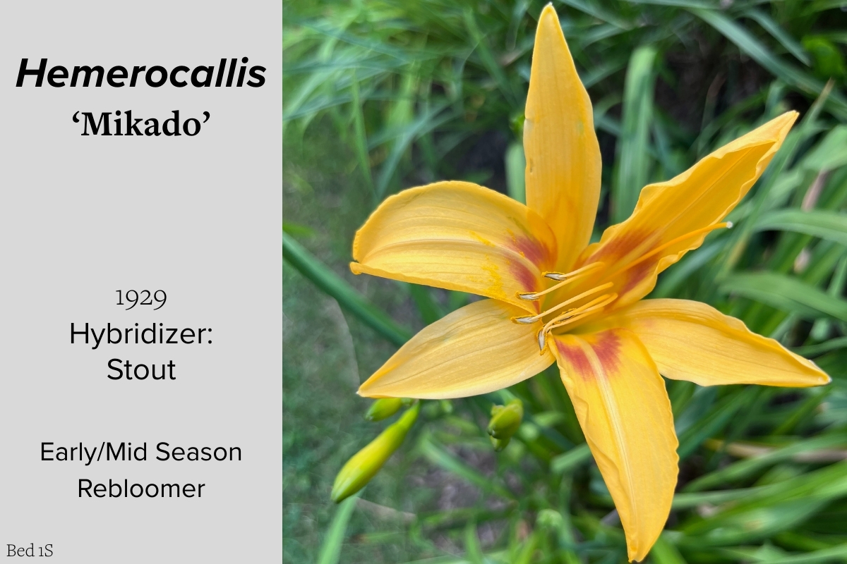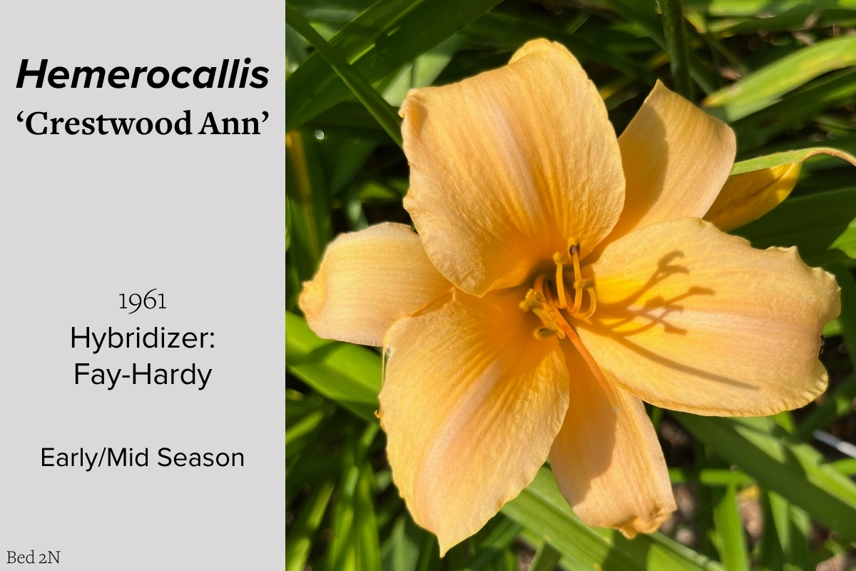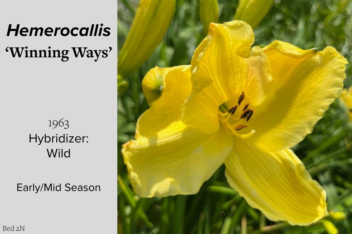 Our collection of 200 daylily cultivars is organized chronologically by the year each was registered with the American Hemerocallis Society. Just beyond this sign at the top of the walk, are six forms of wild daylilies that represent the pure species from which the cultivars were derived.