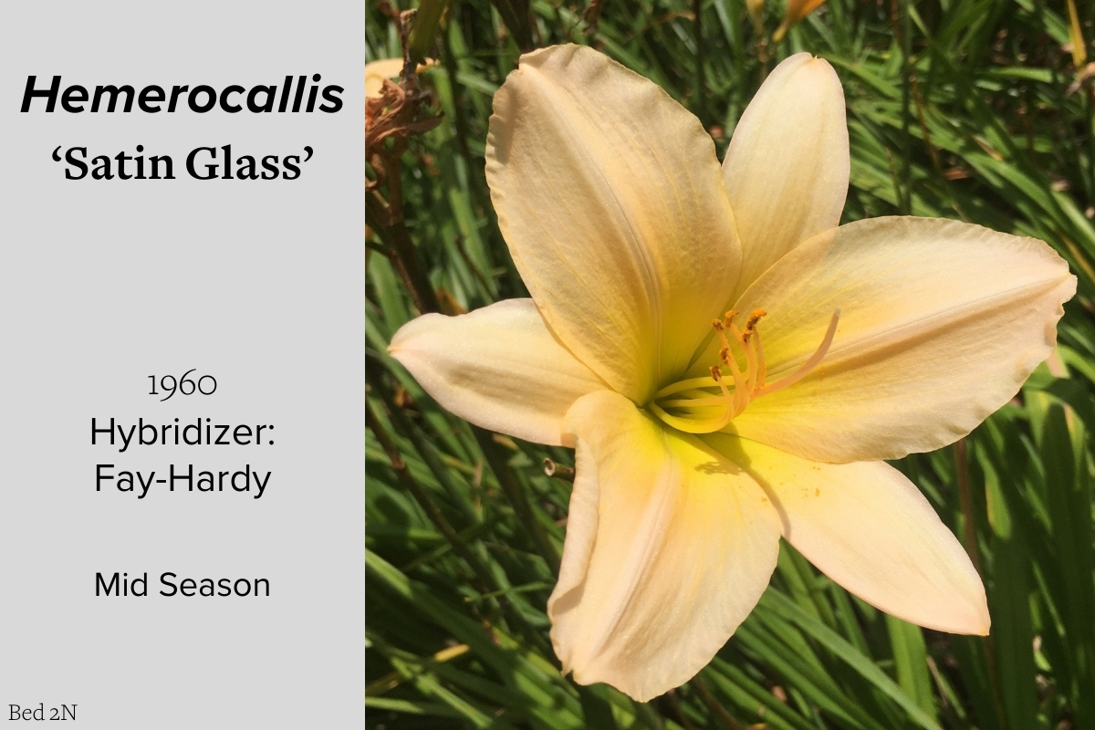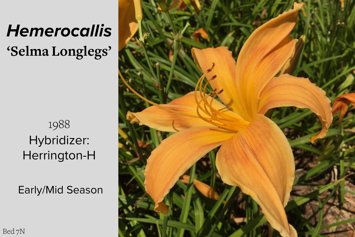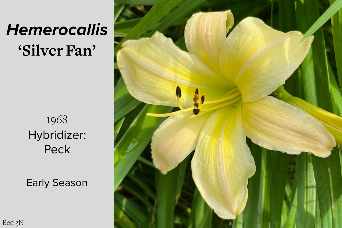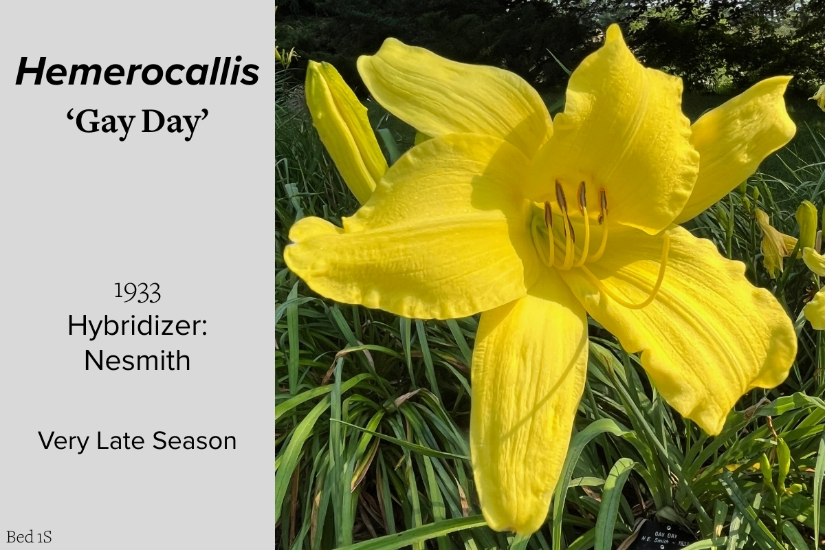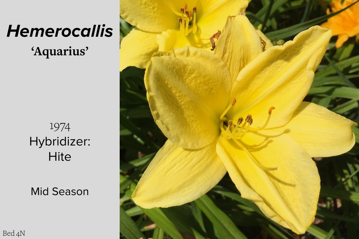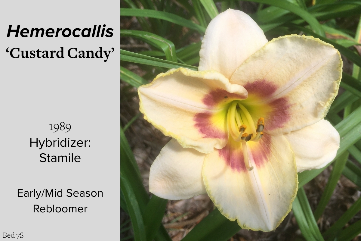Our collection of 200 daylily cultivars is organized chronologically by the year each was registered with the American Hemerocallis Society. Just beyond this sign at the top of the walk, are six forms of wild daylilies that represent the pure species from which the cultivars were derived.