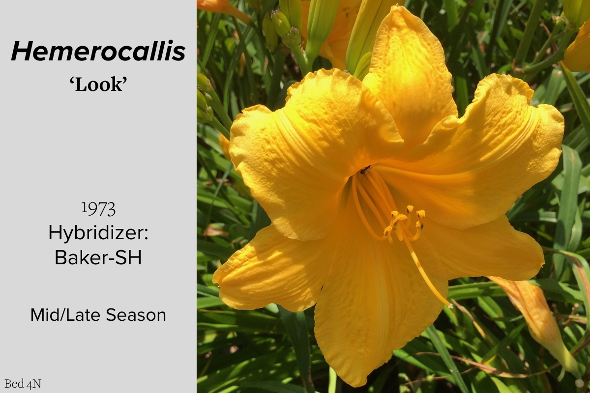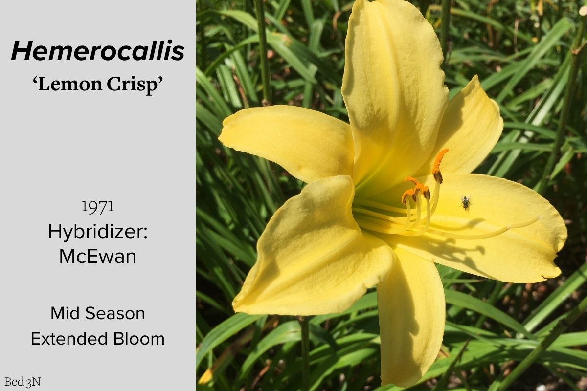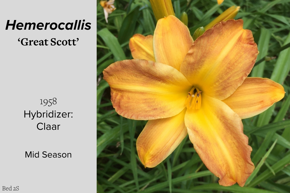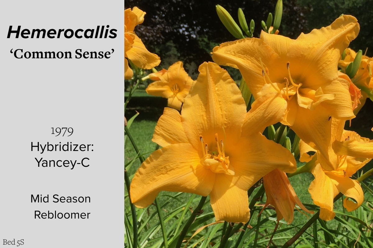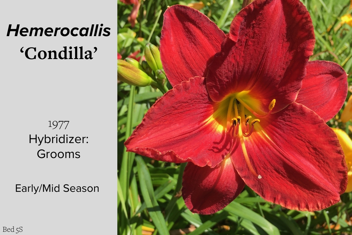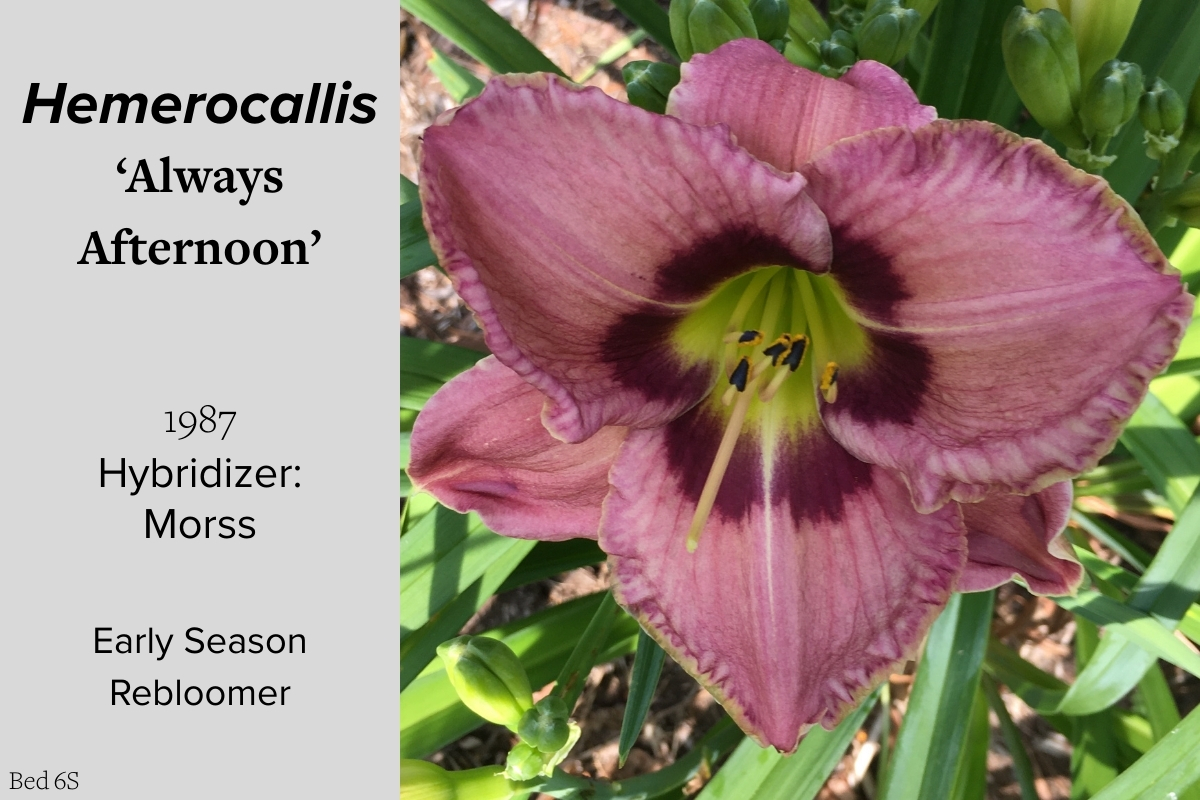 Our collection of 200 daylily cultivars is organized chronologically by the year each was registered with the American Hemerocallis Society. Just beyond this sign at the top of the walk, are six forms of wild daylilies that represent the pure species from which the cultivars were derived.