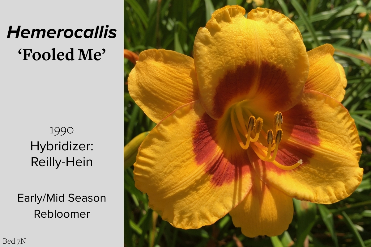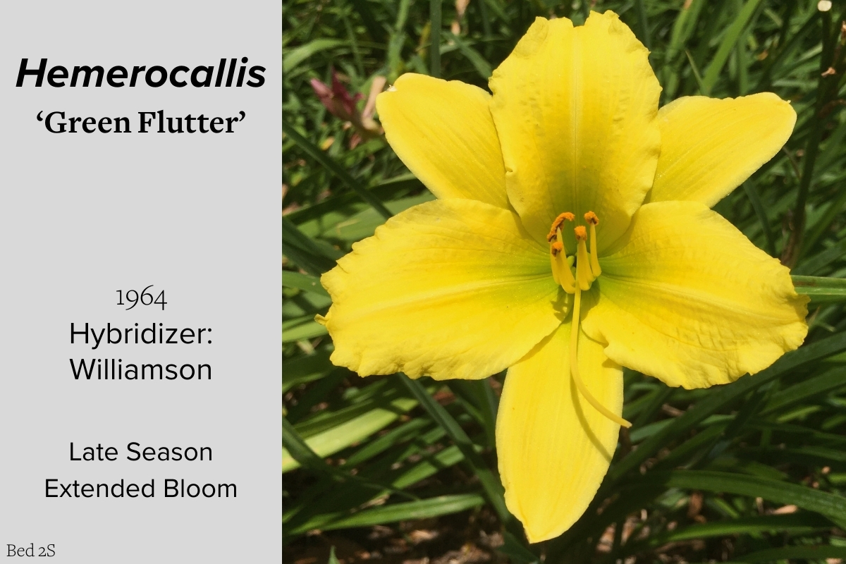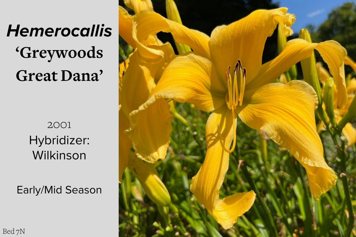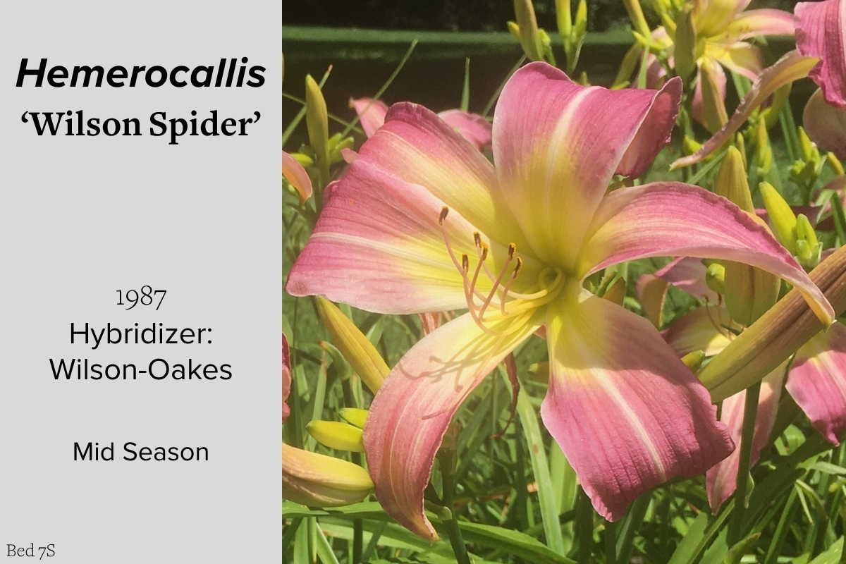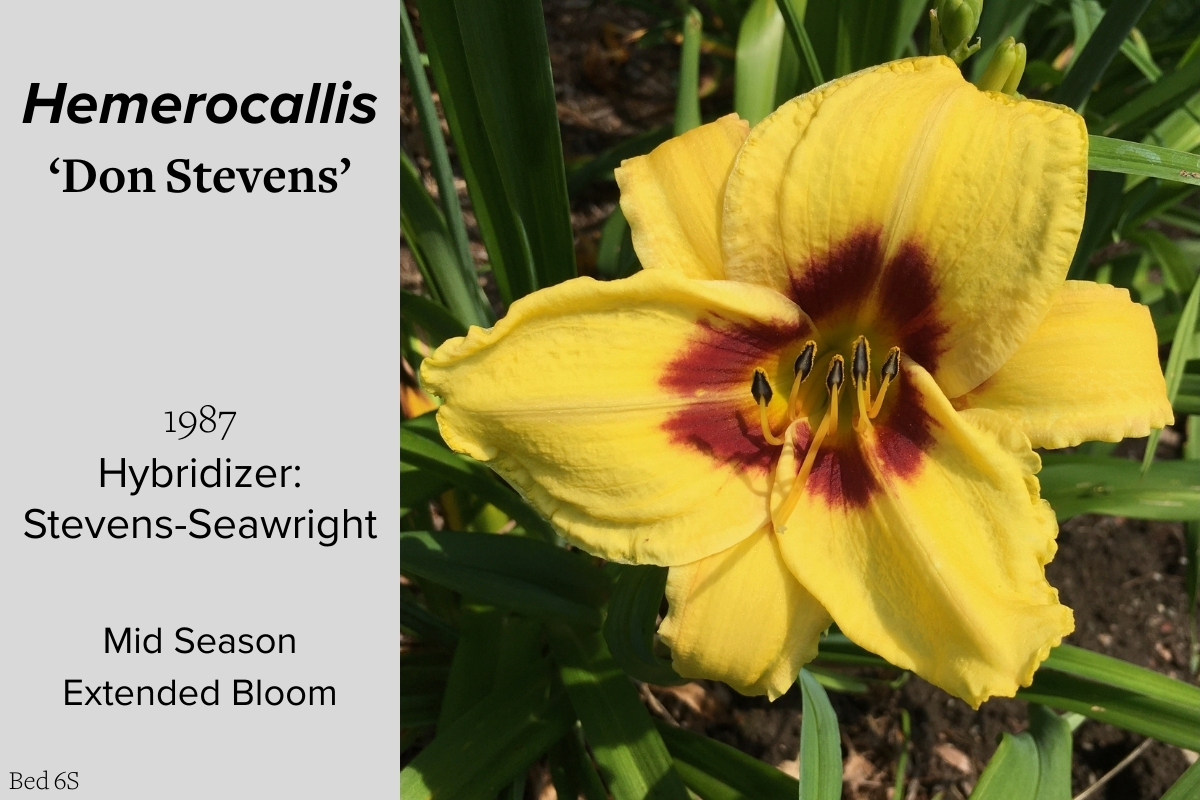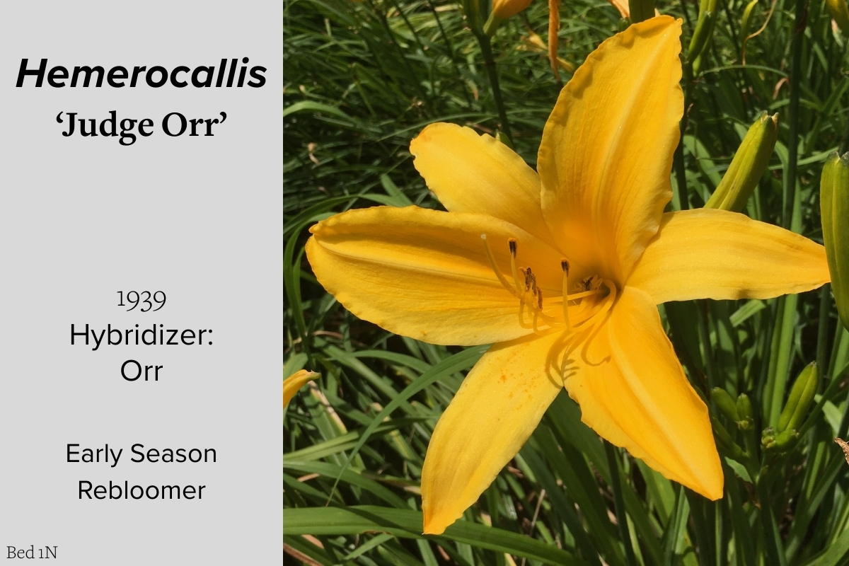 Our collection of 200 daylily cultivars is organized chronologically by the year each was registered with the American Hemerocallis Society. Just beyond this sign at the top of the walk, are six forms of wild daylilies that represent the pure species from which the cultivars were derived.