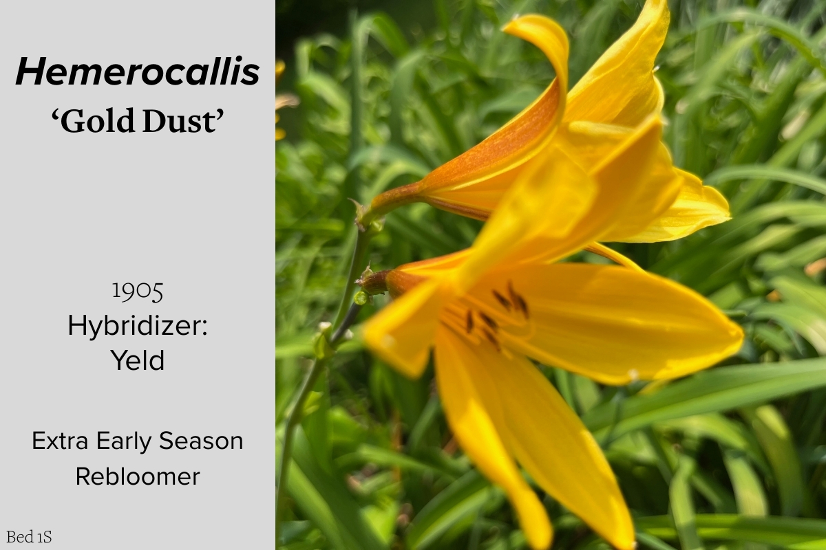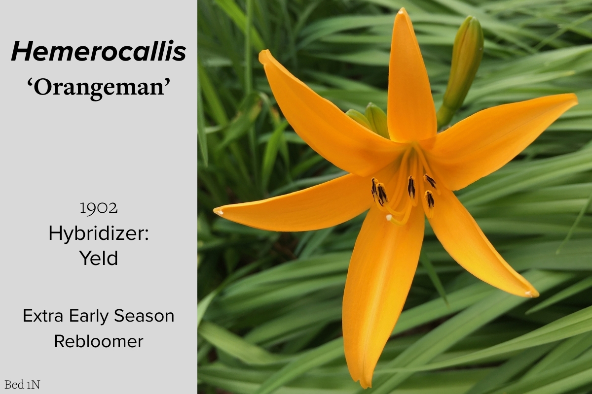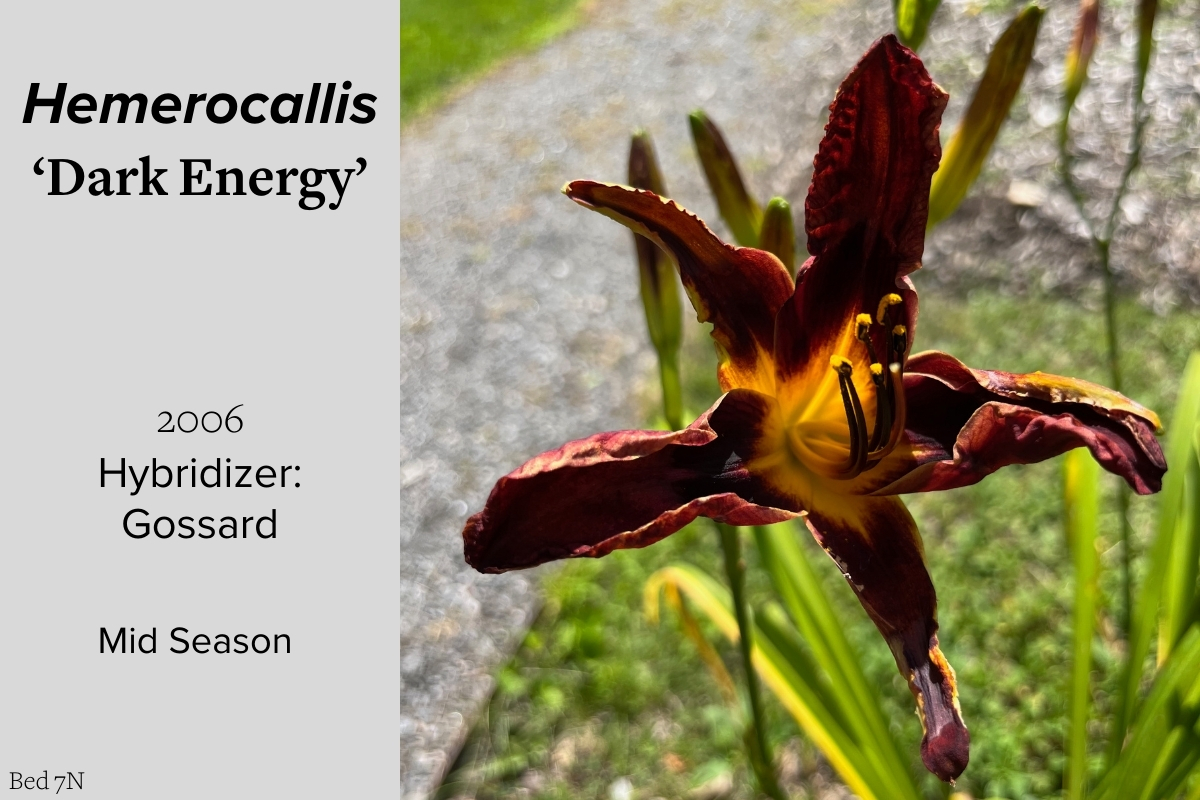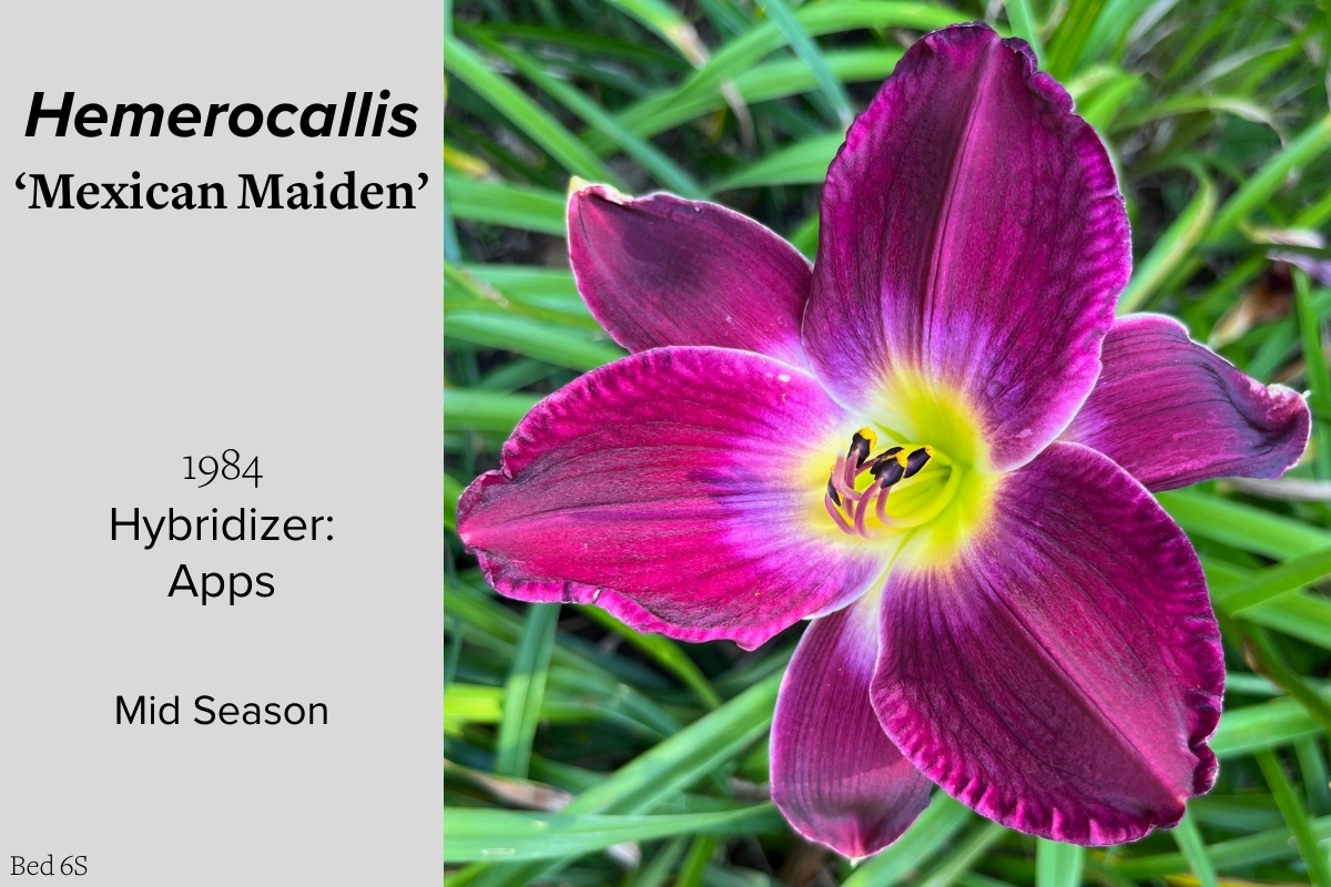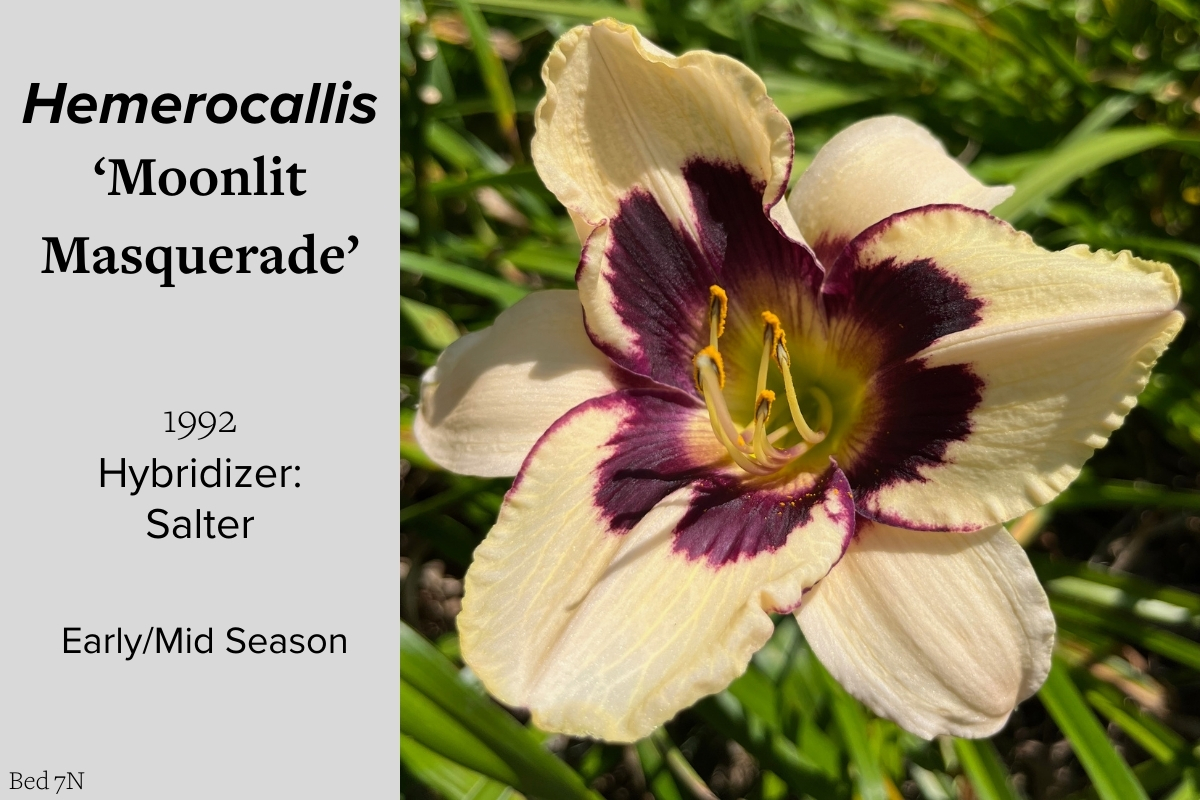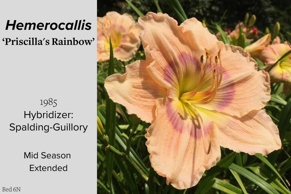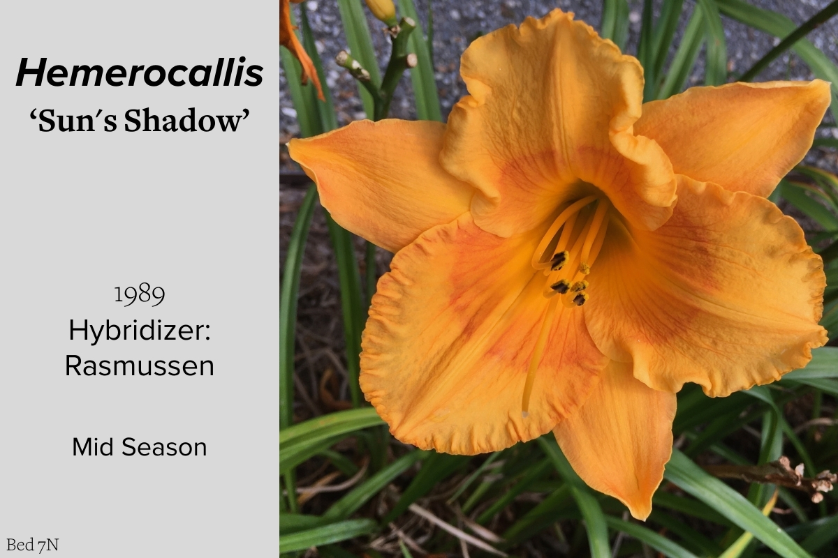 Our collection of 200 daylily cultivars is organized chronologically by the year each was registered with the American Hemerocallis Society. Just beyond this sign at the top of the walk, are six forms of wild daylilies that represent the pure species from which the cultivars were derived.