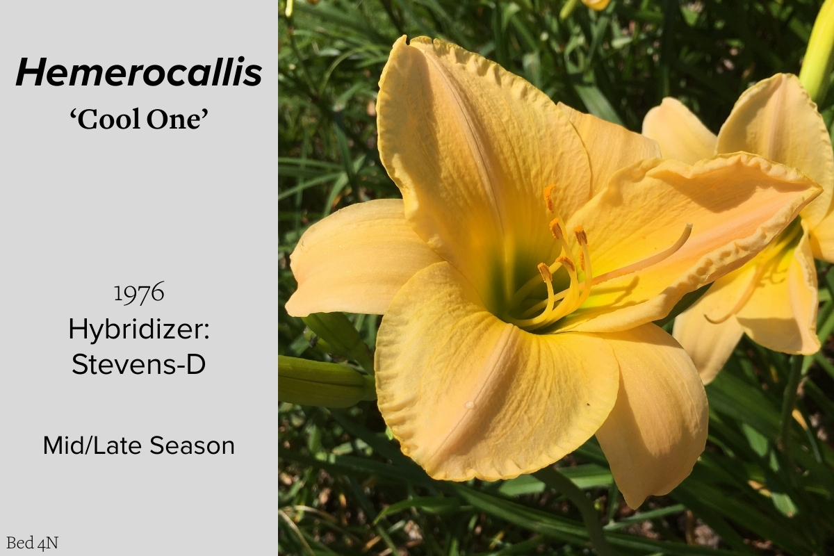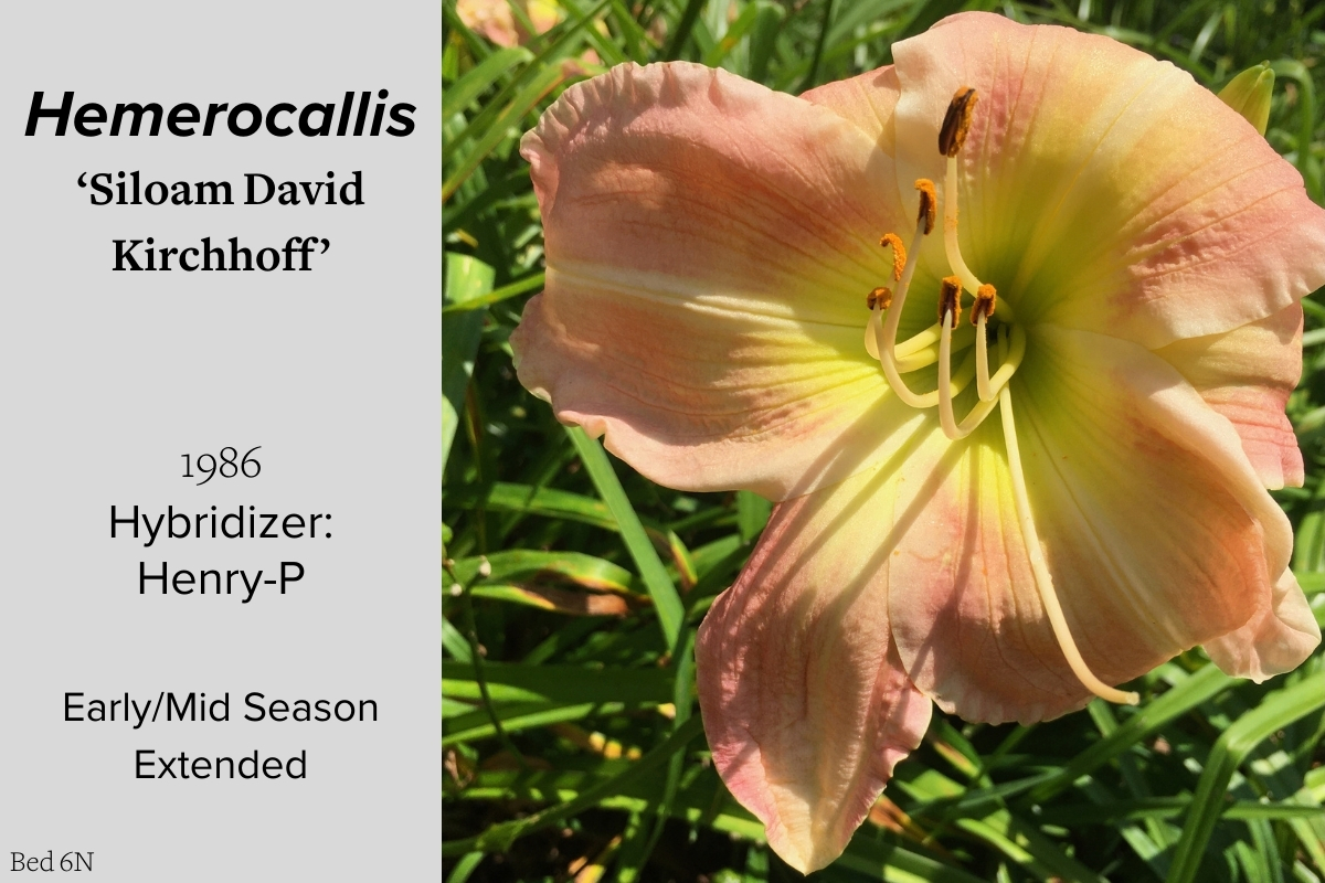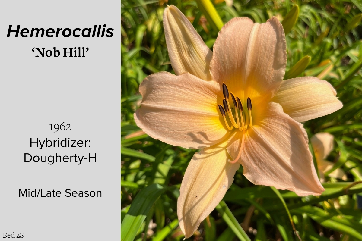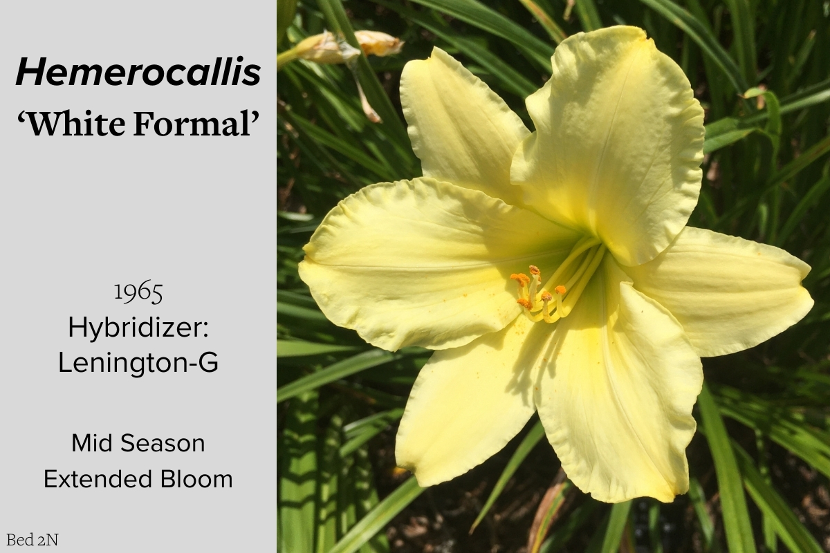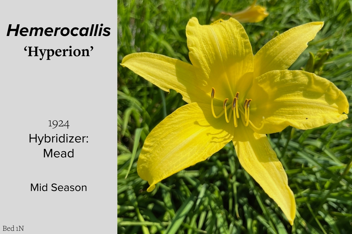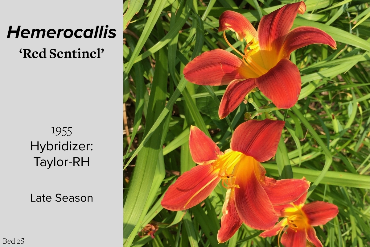 Our collection of 200 daylily cultivars is organized chronologically by the year each was registered with the American Hemerocallis Society. Just beyond this sign at the top of the walk, are six forms of wild daylilies that represent the pure species from which the cultivars were derived.