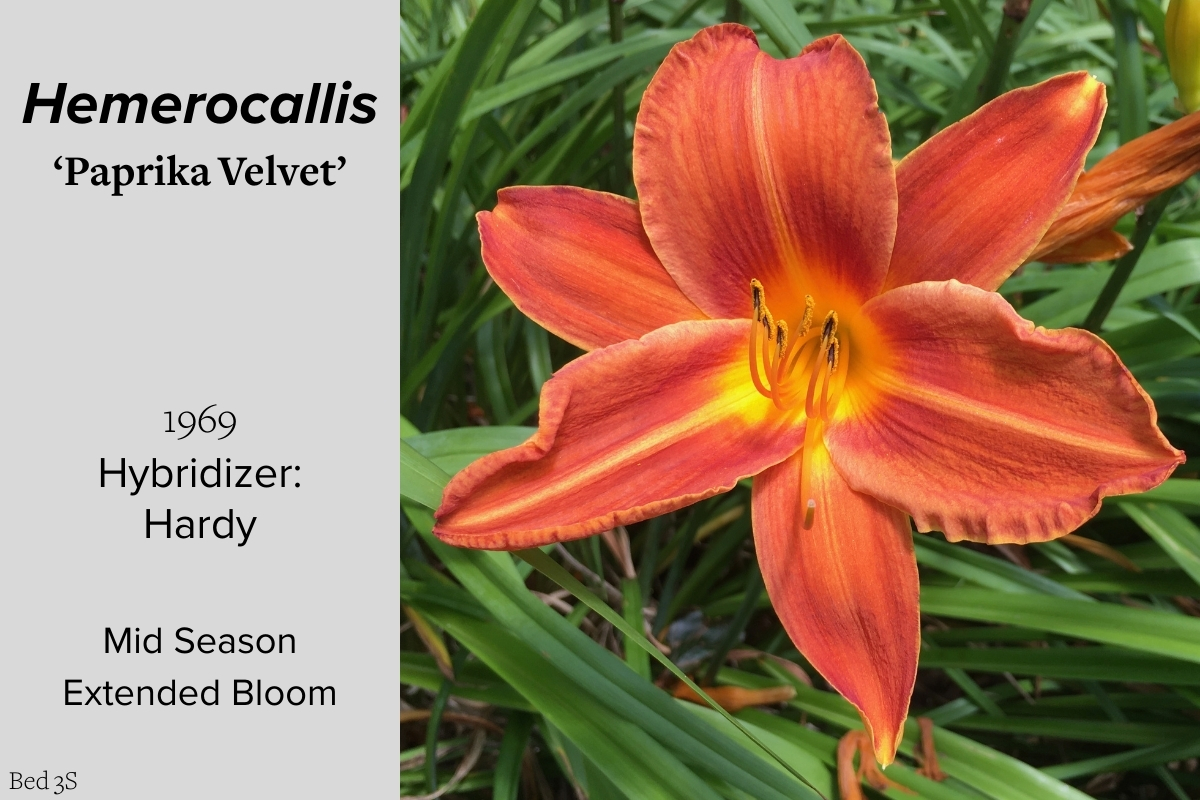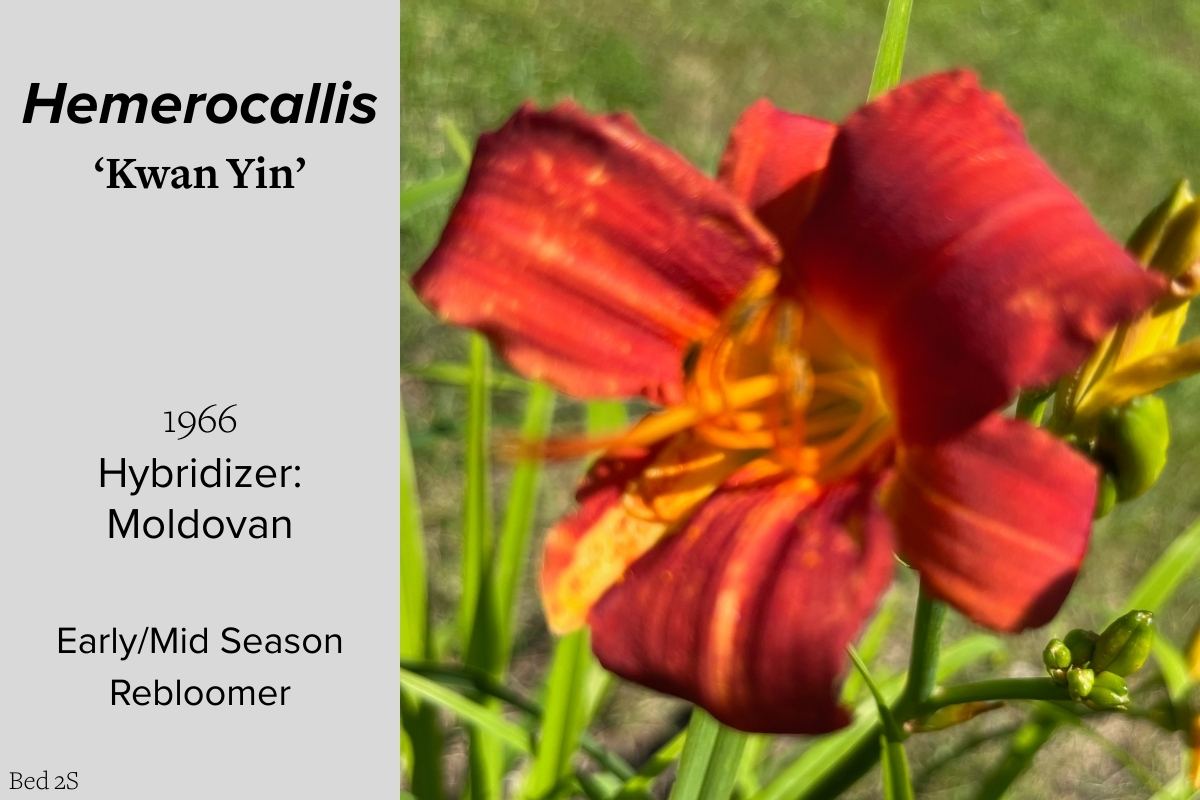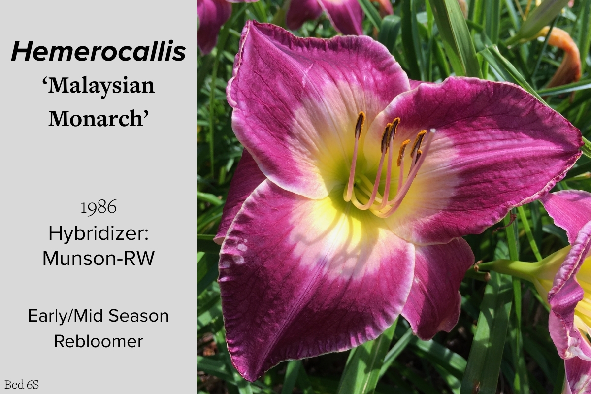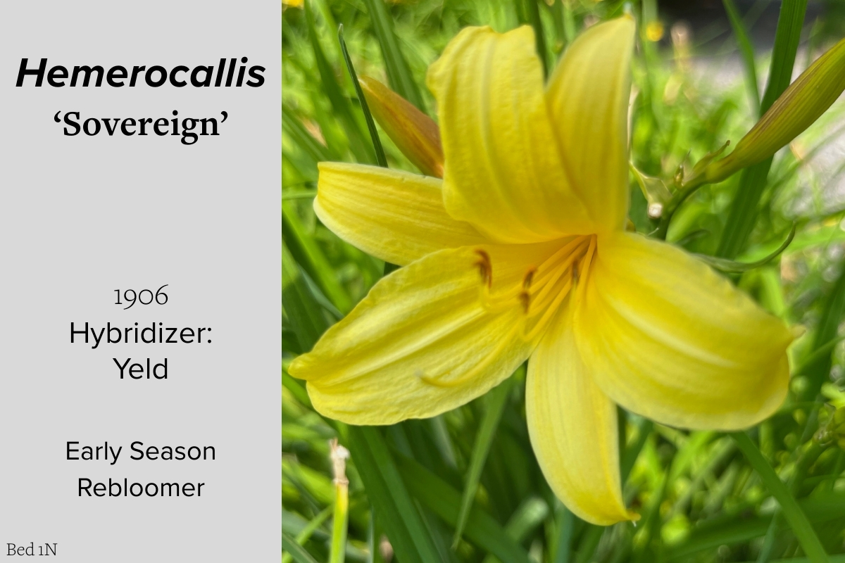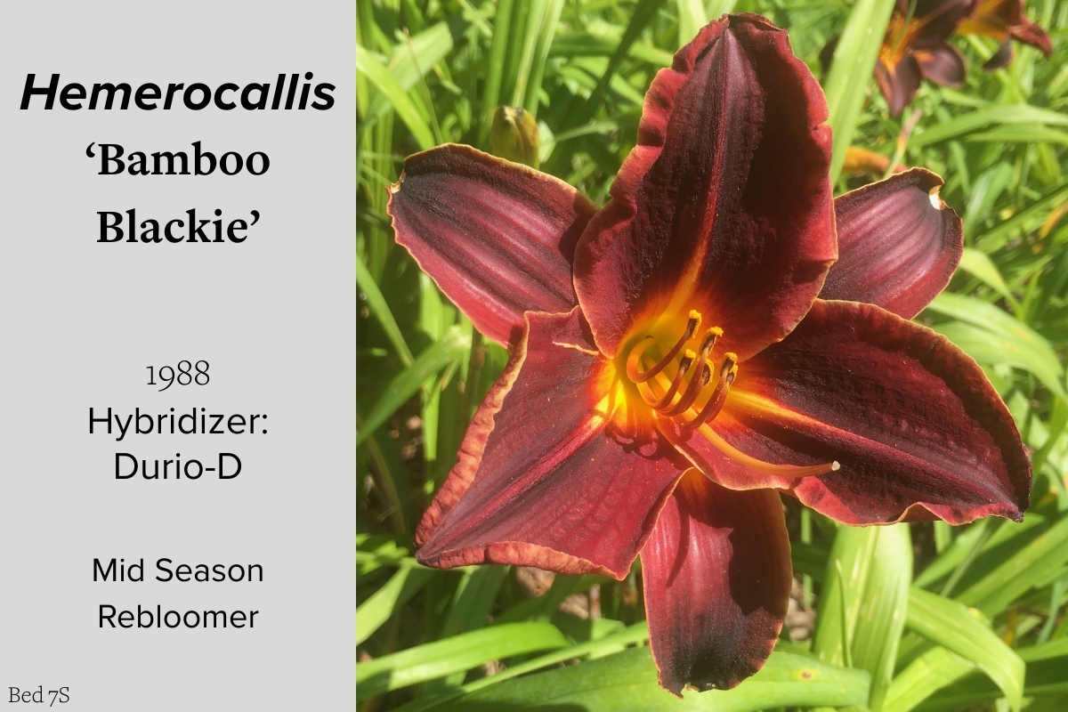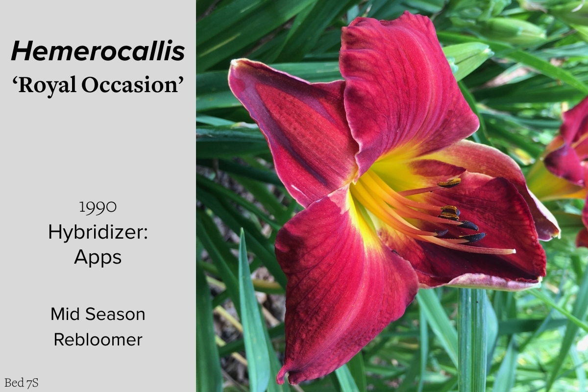Our collection of 200 daylily cultivars is organized chronologically by the year each was registered with the American Hemerocallis Society. Just beyond this sign at the top of the walk, are six forms of wild daylilies that represent the pure species from which the cultivars were derived.
