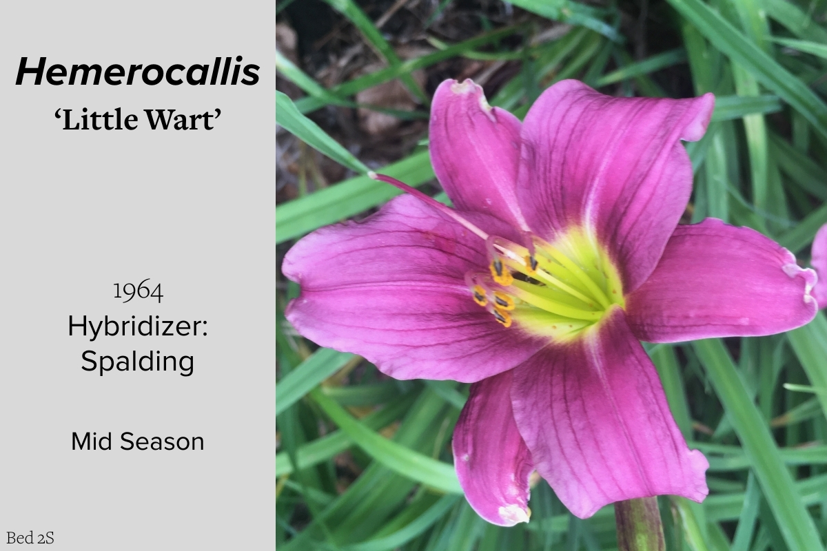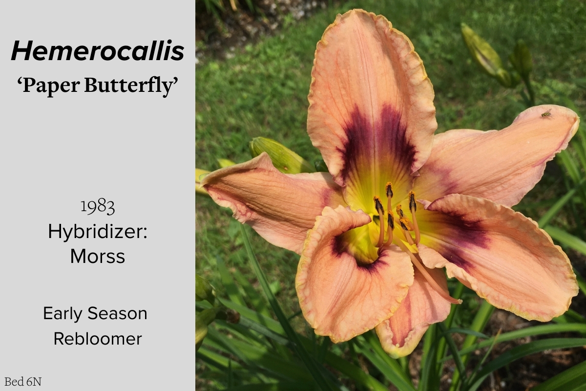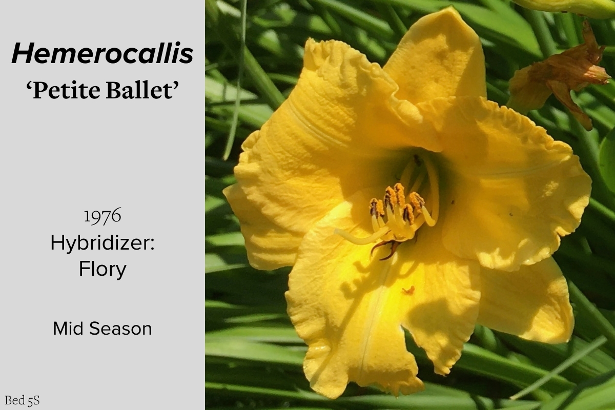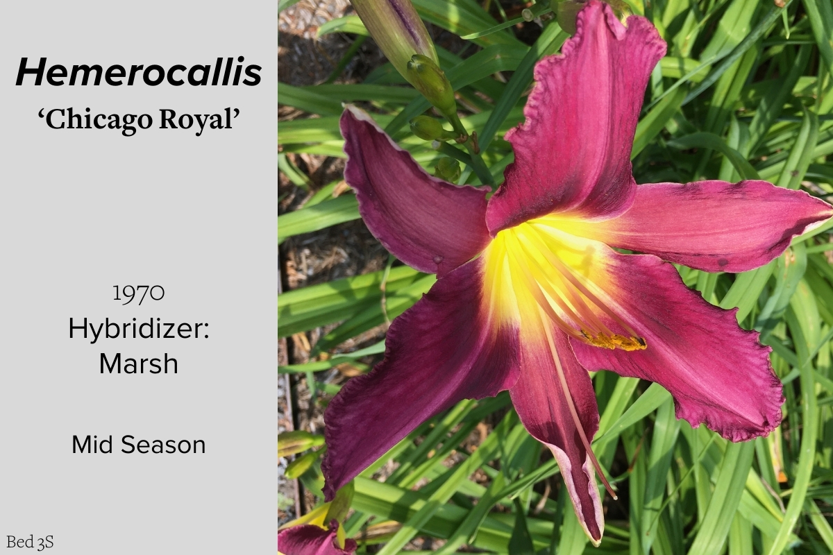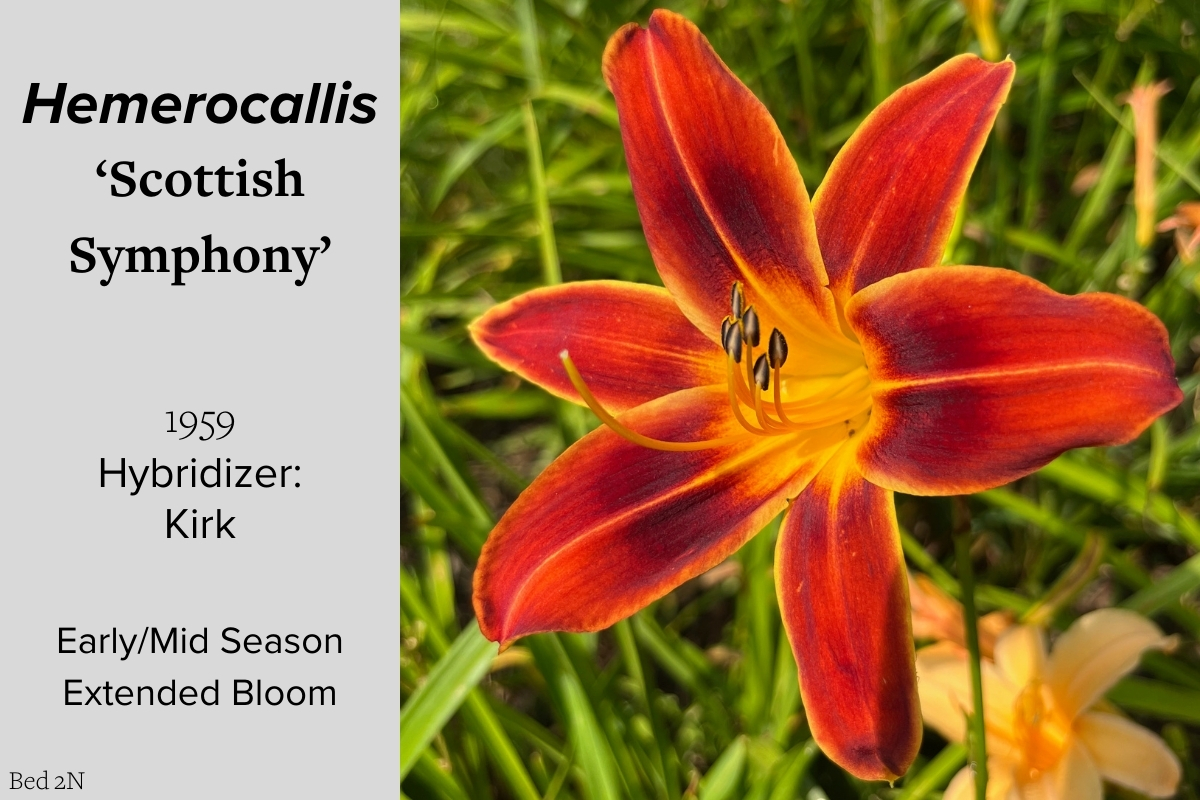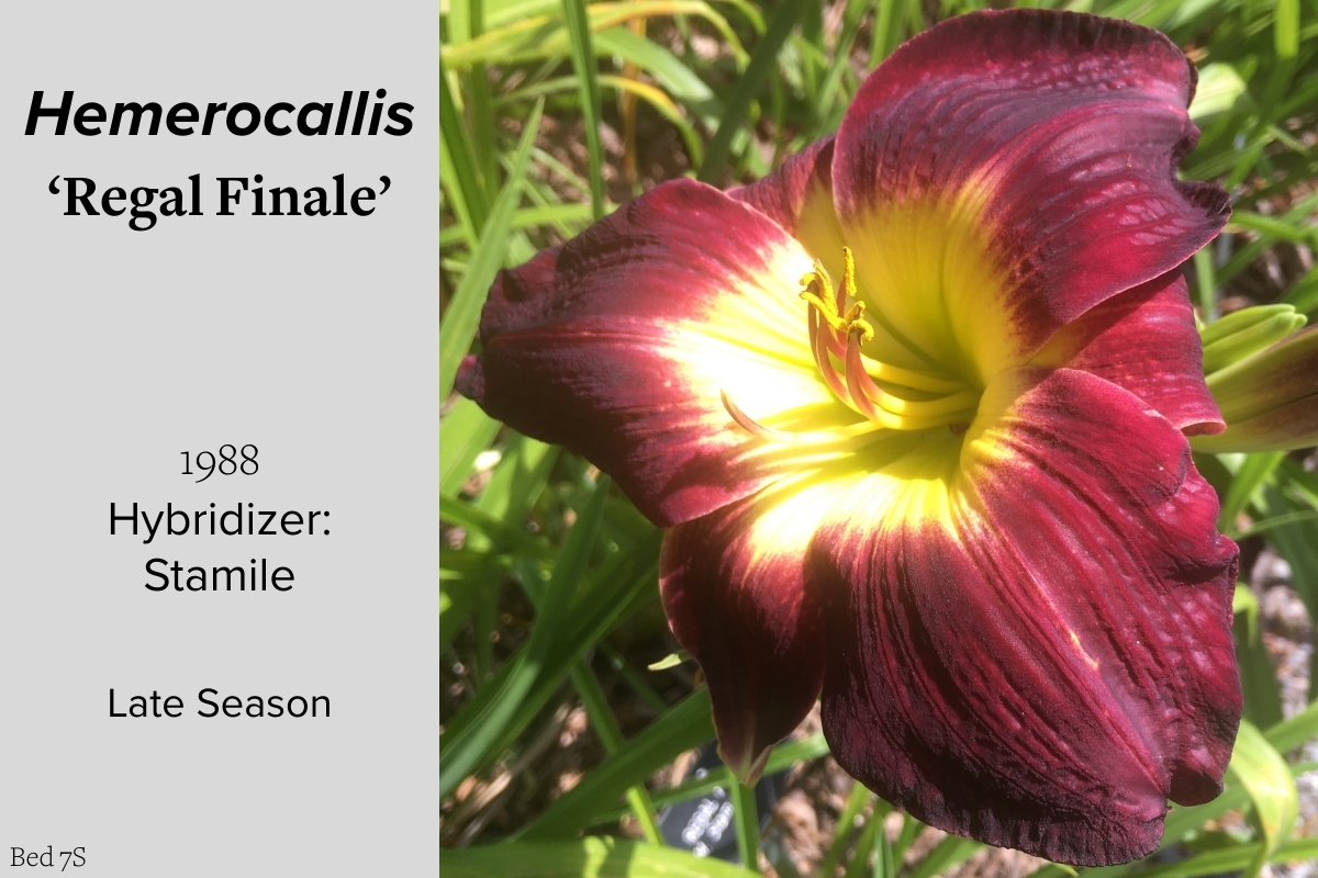 Our collection of 200 daylily cultivars is organized chronologically by the year each was registered with the American Hemerocallis Society. Just beyond this sign at the top of the walk, are six forms of wild daylilies that represent the pure species from which the cultivars were derived.