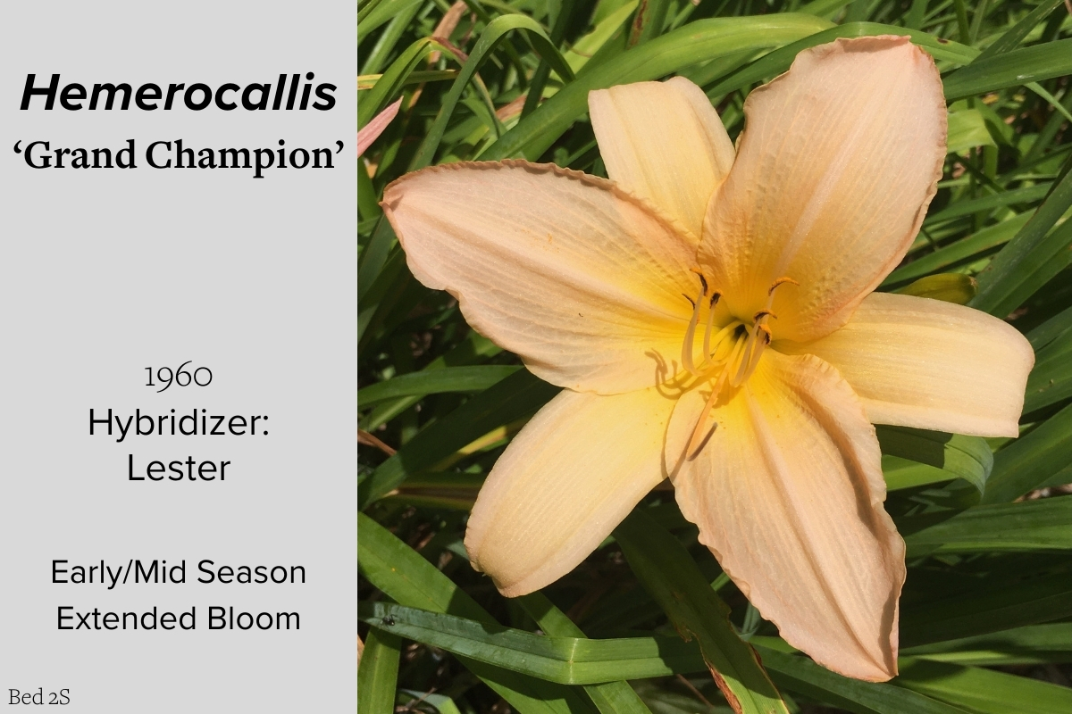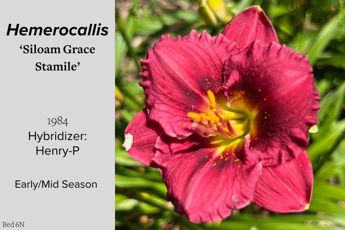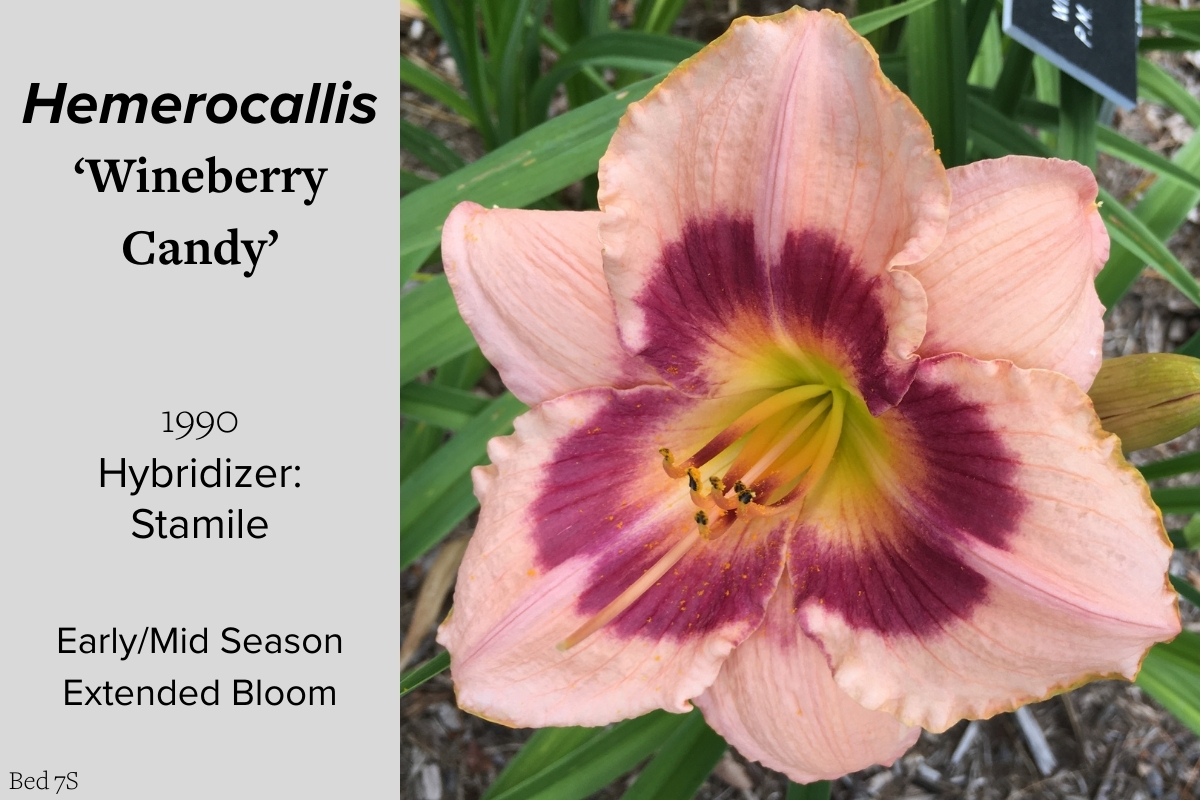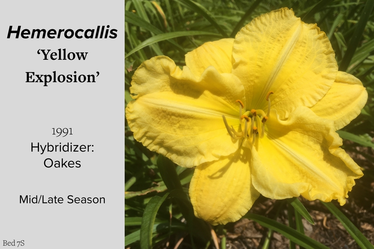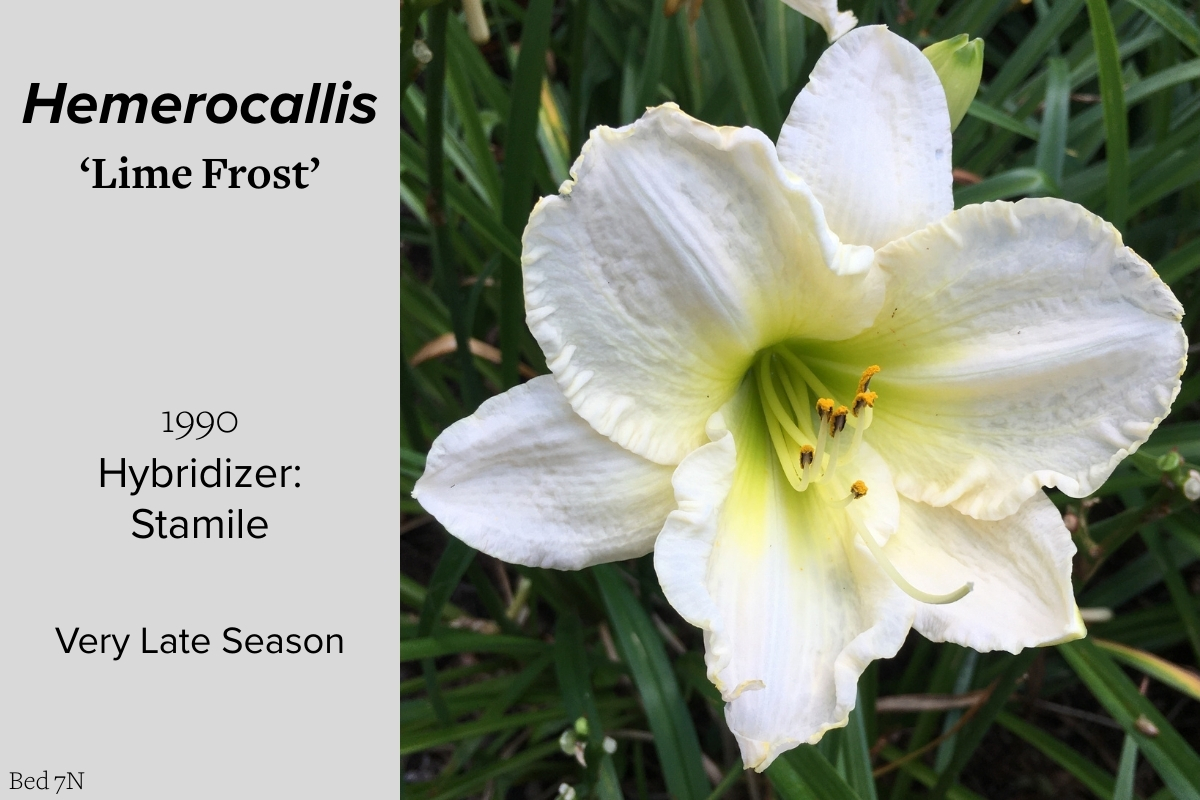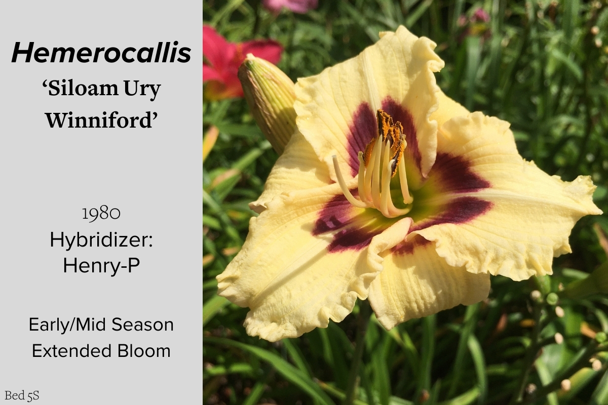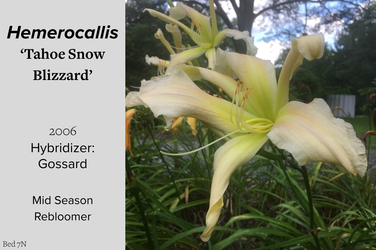 Our collection of 200 daylily cultivars is organized chronologically by the year each was registered with the American Hemerocallis Society. Just beyond this sign at the top of the walk, are six forms of wild daylilies that represent the pure species from which the cultivars were derived.