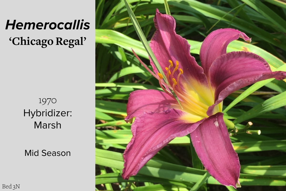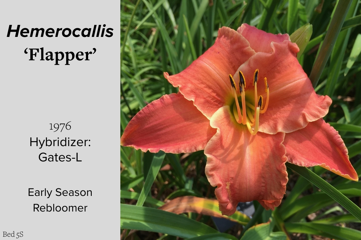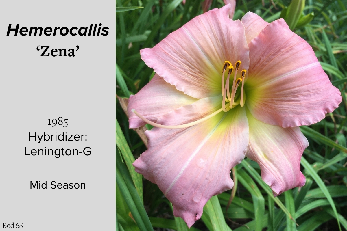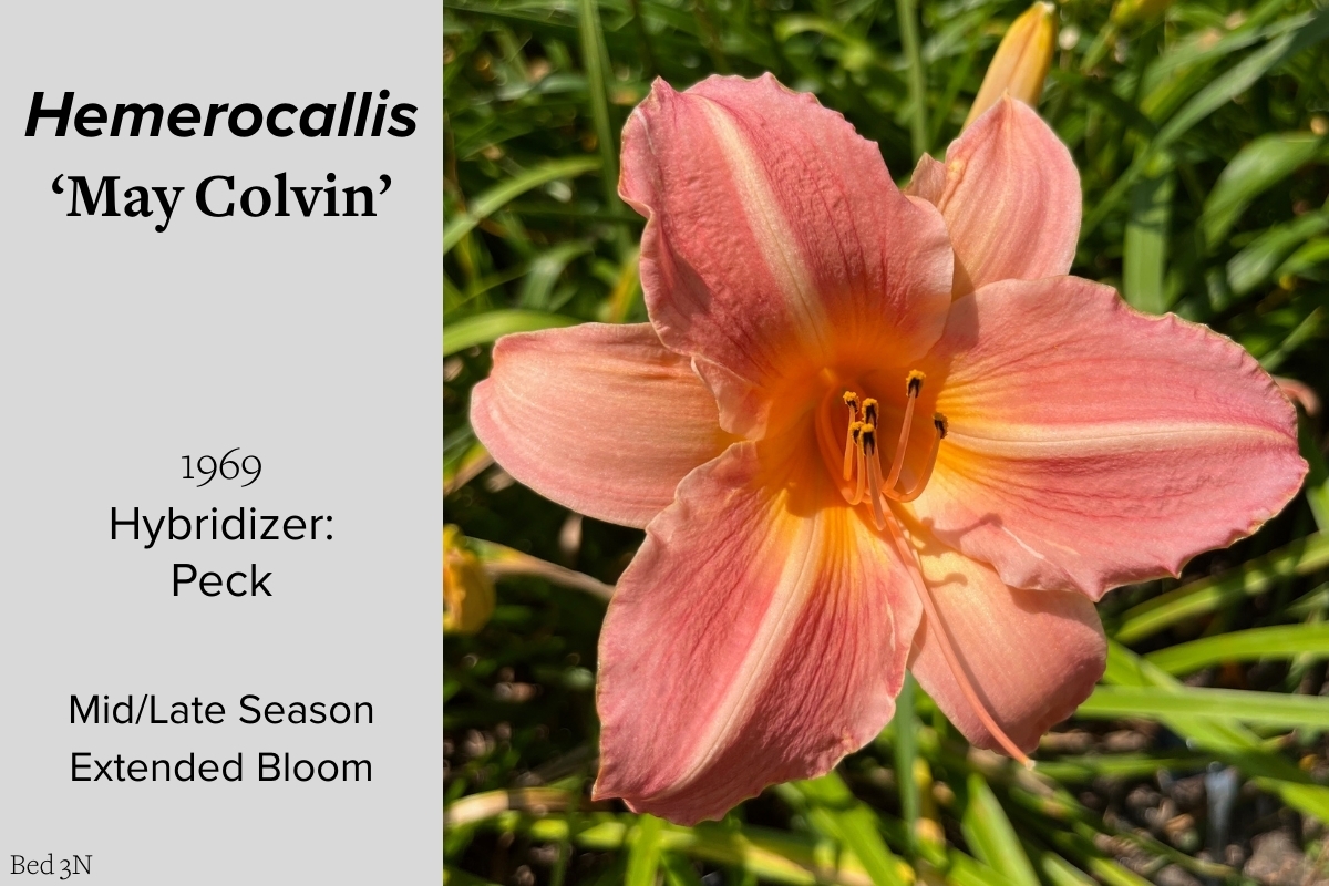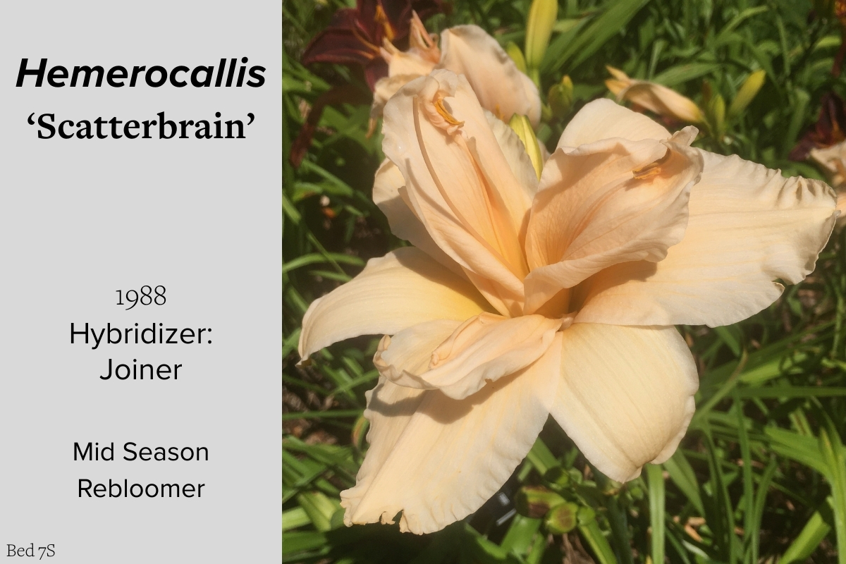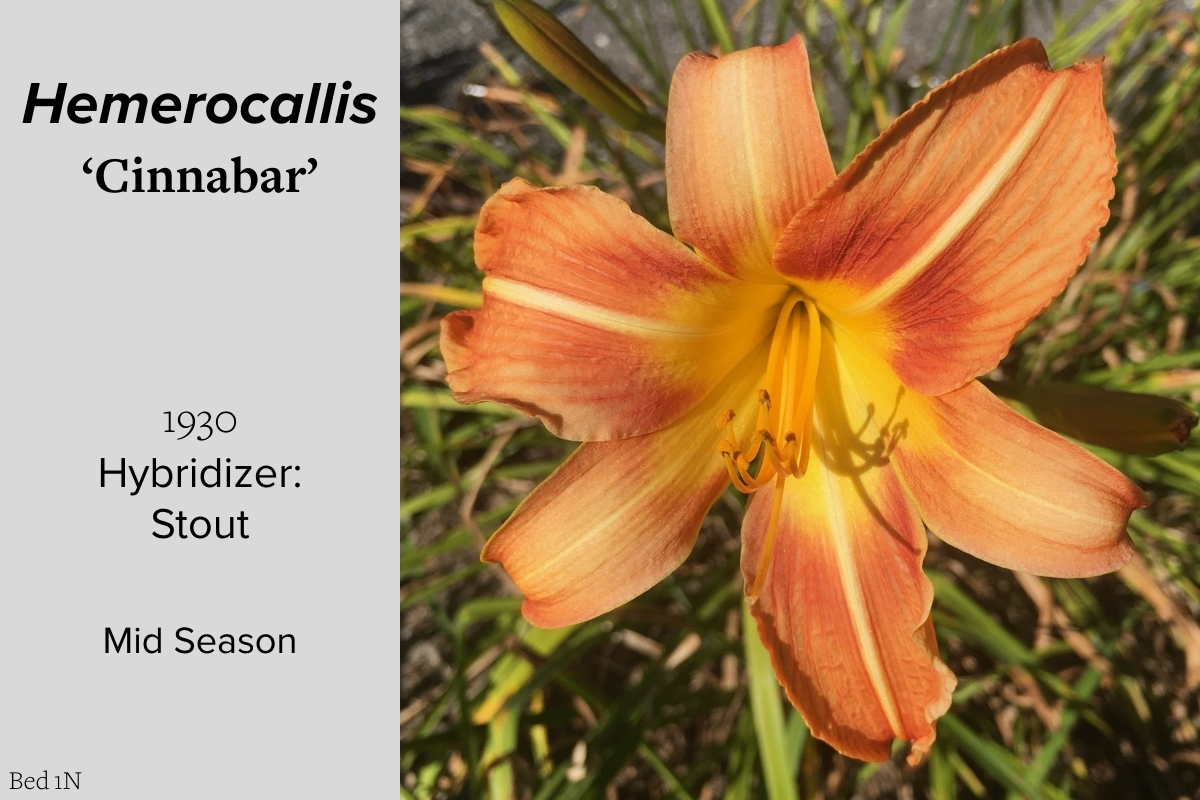 Our collection of 200 daylily cultivars is organized chronologically by the year each was registered with the American Hemerocallis Society. Just beyond this sign at the top of the walk, are six forms of wild daylilies that represent the pure species from which the cultivars were derived.
