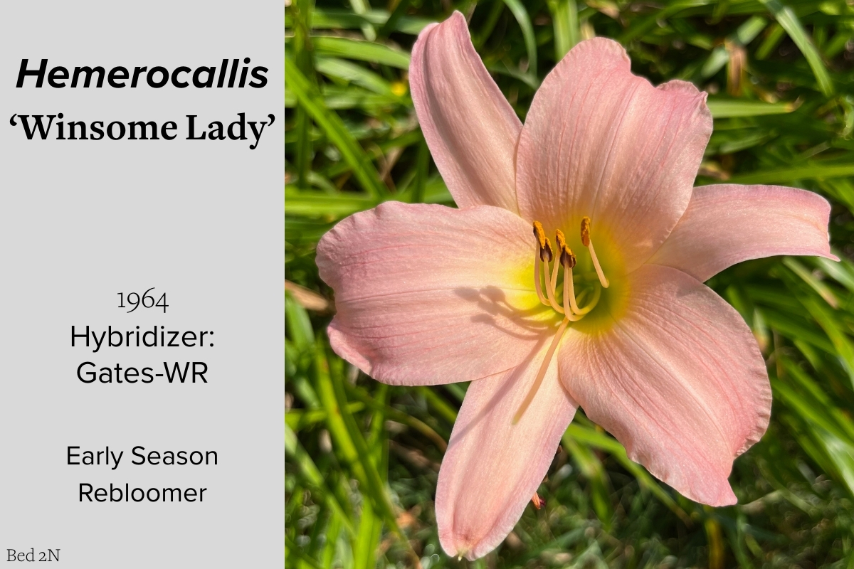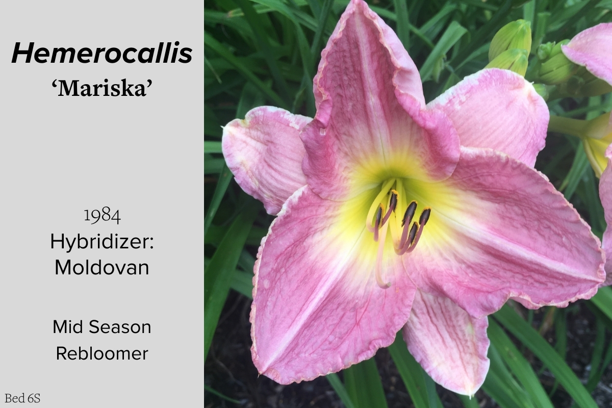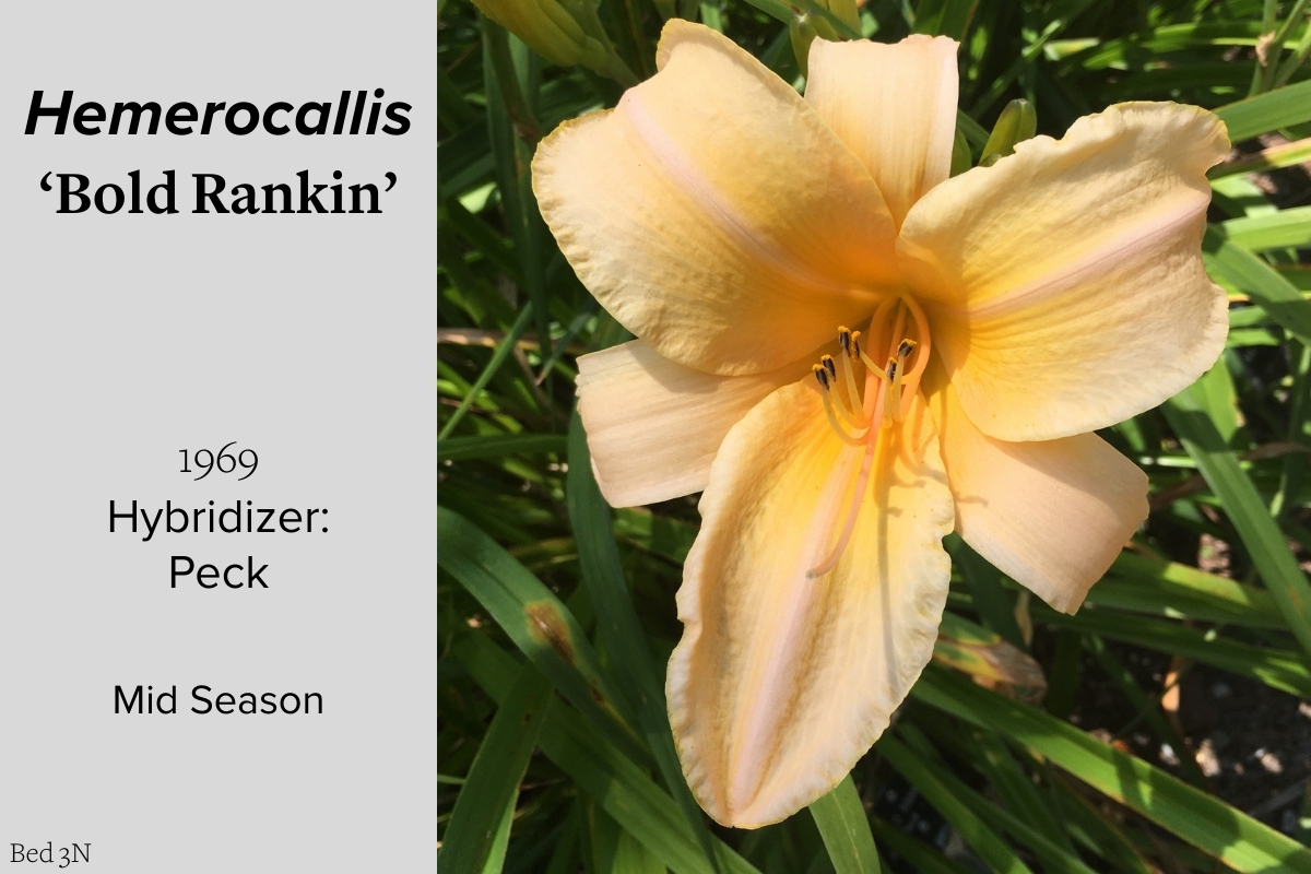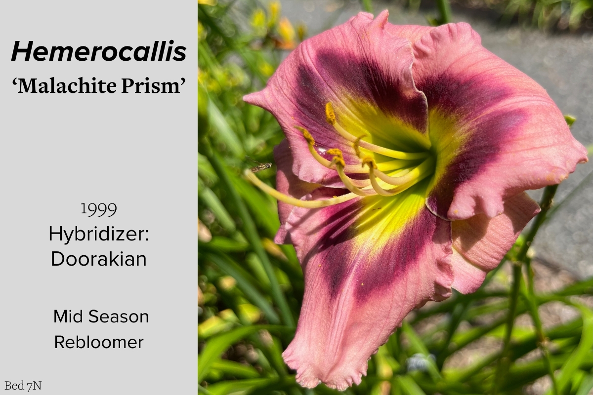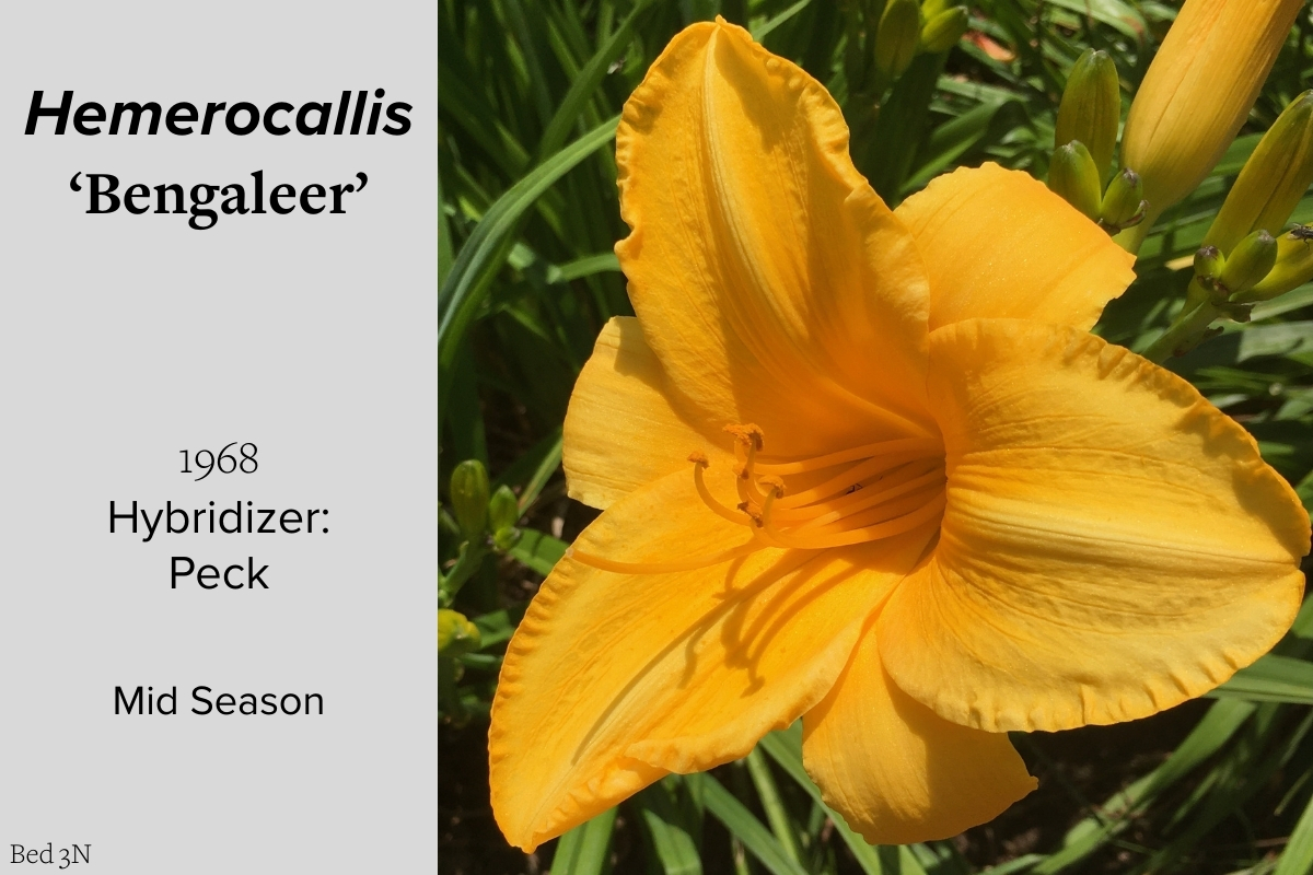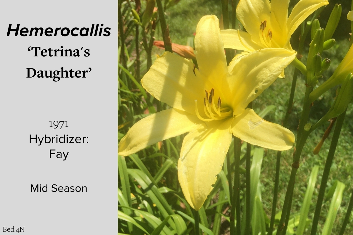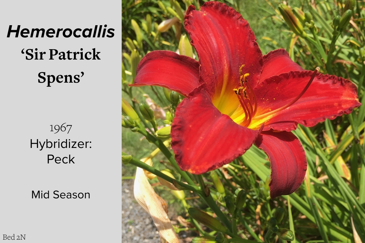 Our collection of 200 daylily cultivars is organized chronologically by the year each was registered with the American Hemerocallis Society. Just beyond this sign at the top of the walk, are six forms of wild daylilies that represent the pure species from which the cultivars were derived.
